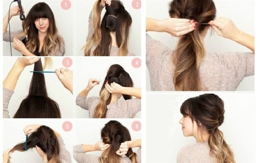 - Gather the hair in a low ponytail, and then turn the tip of the tail itself inside out, as indicated in the photo.