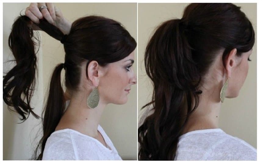 - Tie the lower hair with an elastic band and lower the upper ponytail on it.