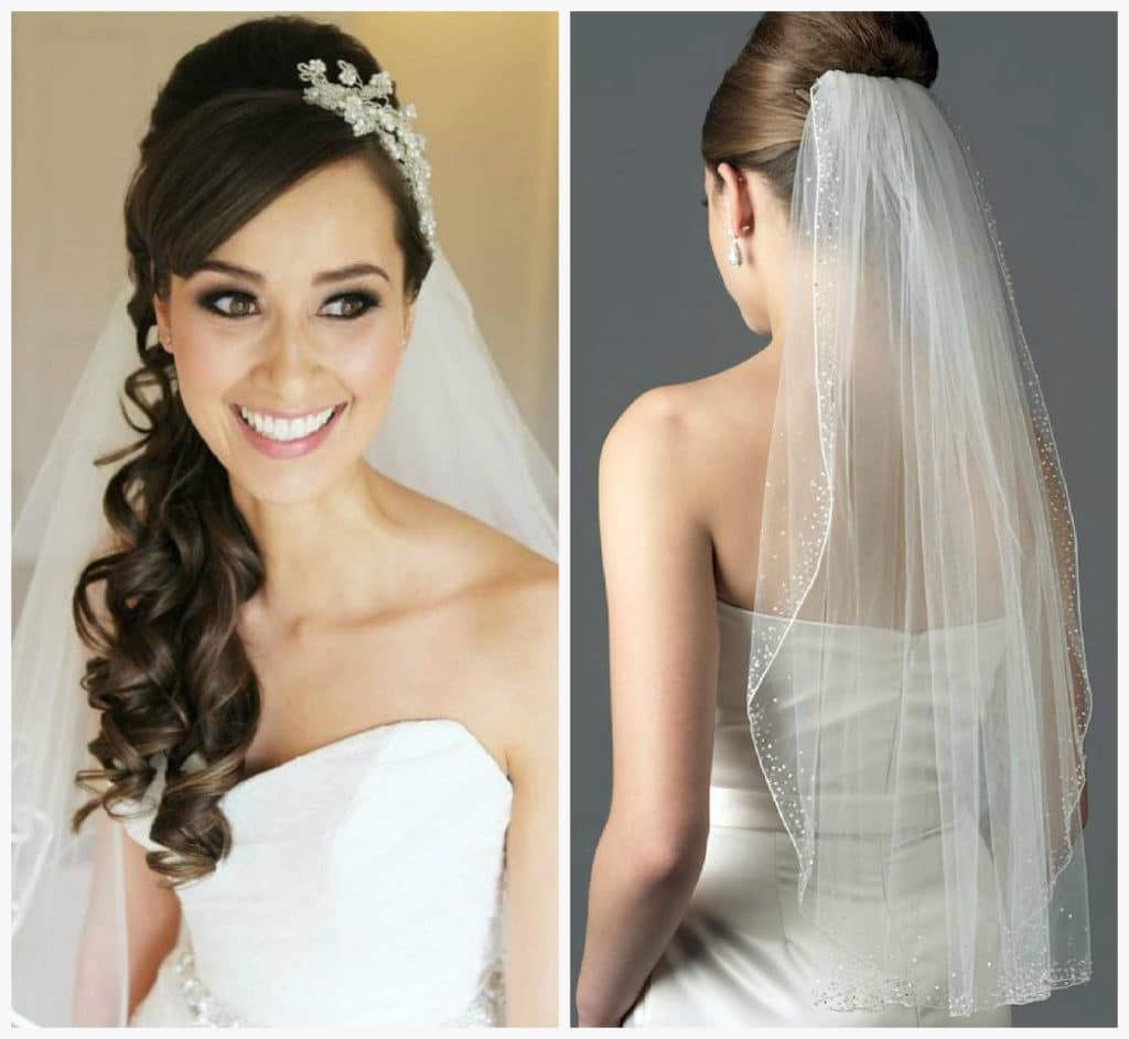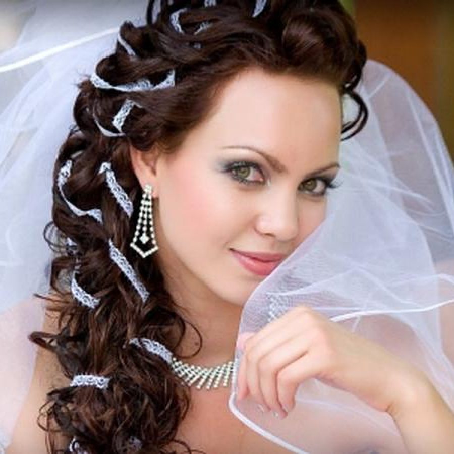 In hairstyles with a veil on long hair, you can use a variety of decor. These can be ribbons that are woven into a braid, tiaras, as well as hairpins.