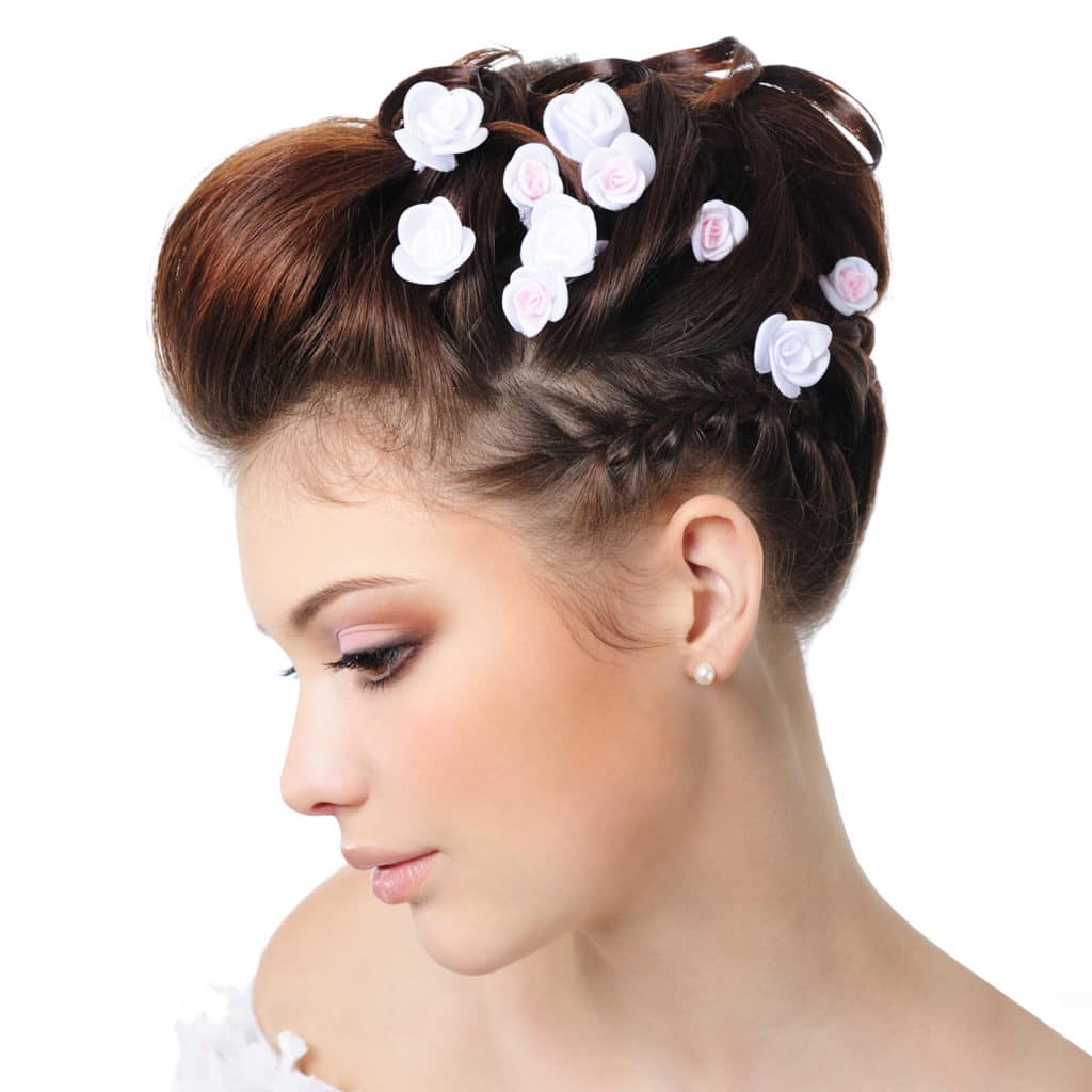 You can decorate with such flowers, as well as collected hair in a high bun, or a hairstyle in the Greek style, and on loose hair.