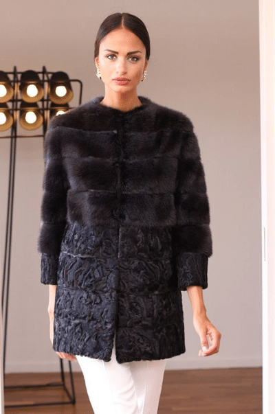In addition to fur, leather and satin inserts in astrakhan fur coats are very popular. To give a twist to a classic astrakhan fur coat, sometimes just a satin belt is enough. Inlays can be in harmony with accessories or shoes to complete the look.