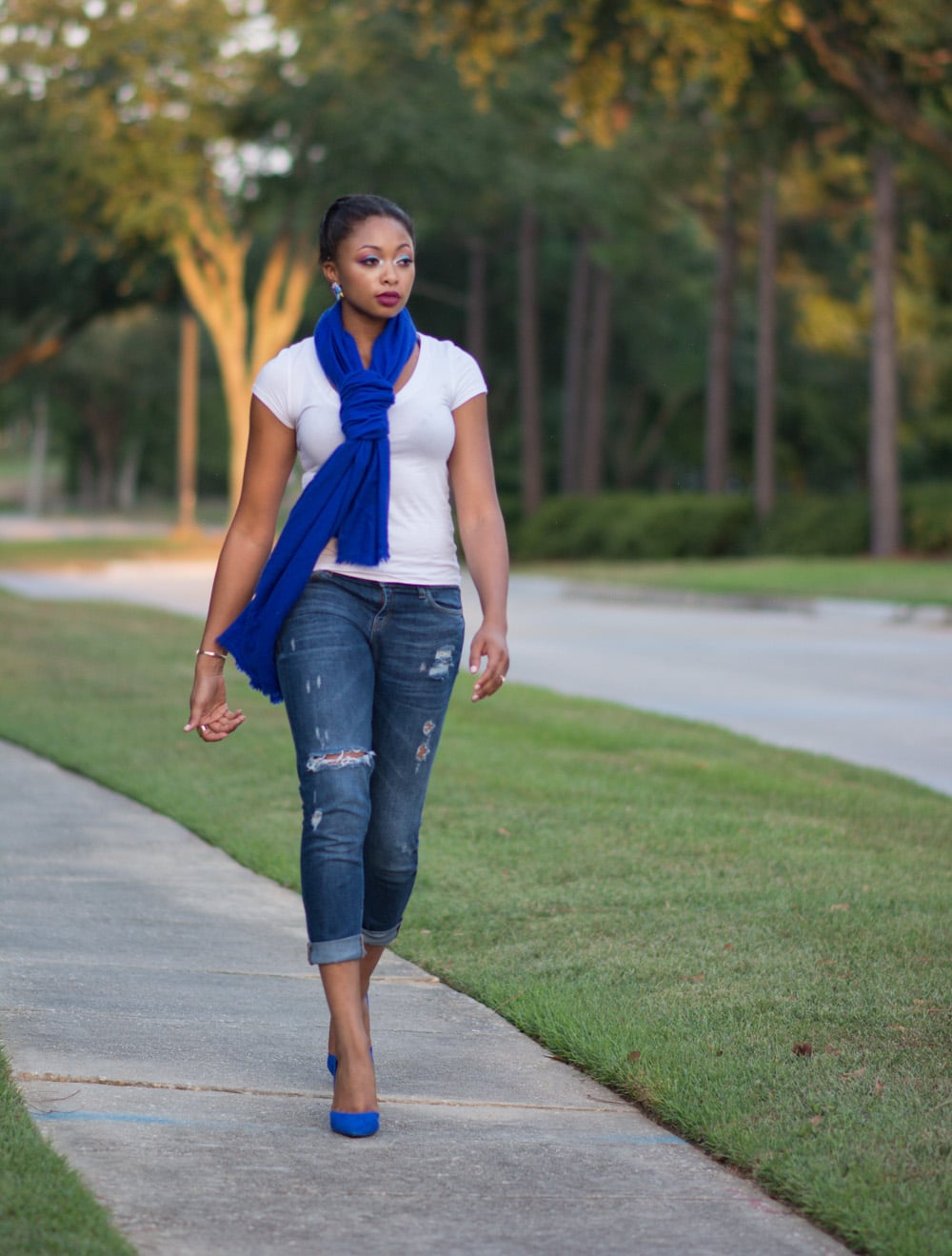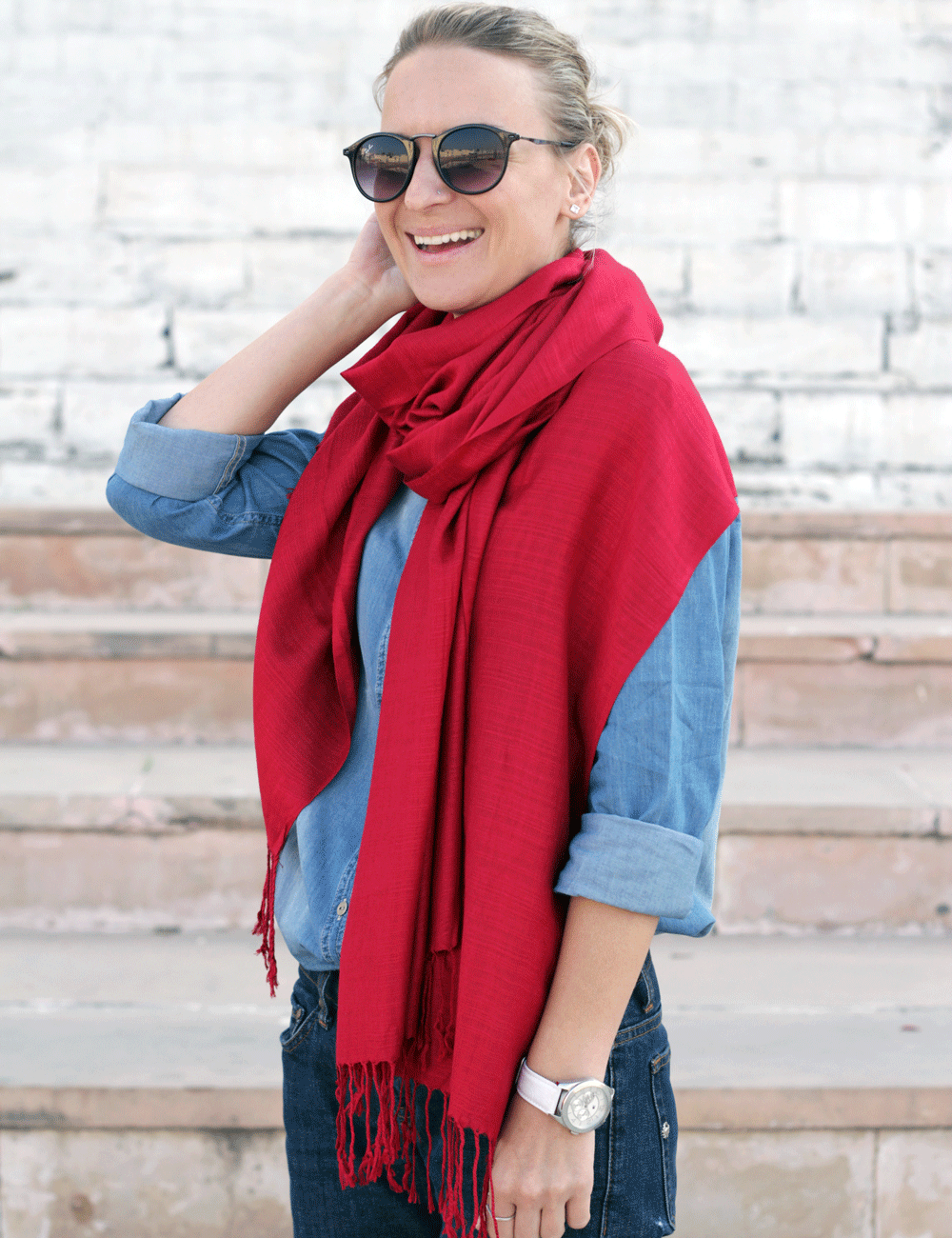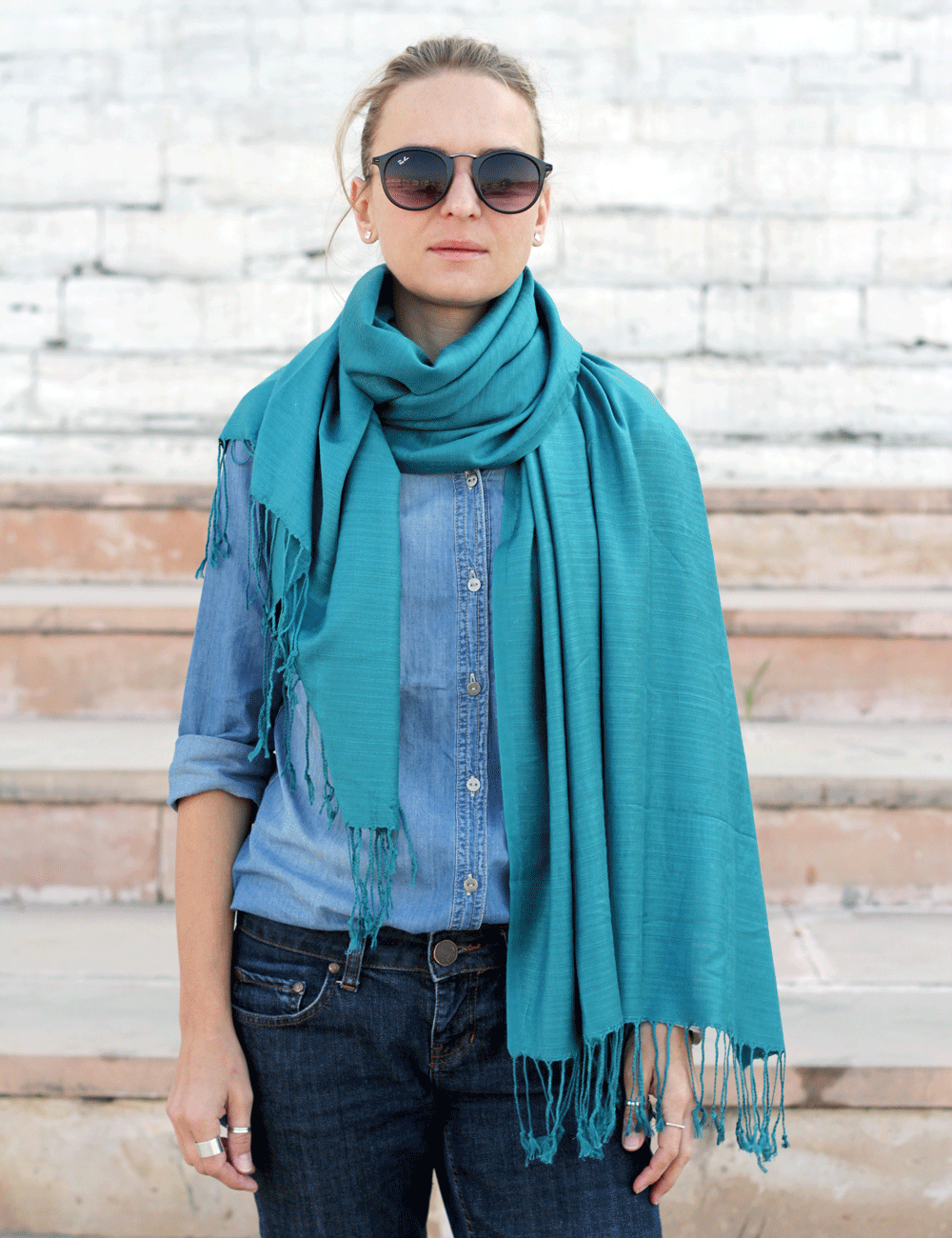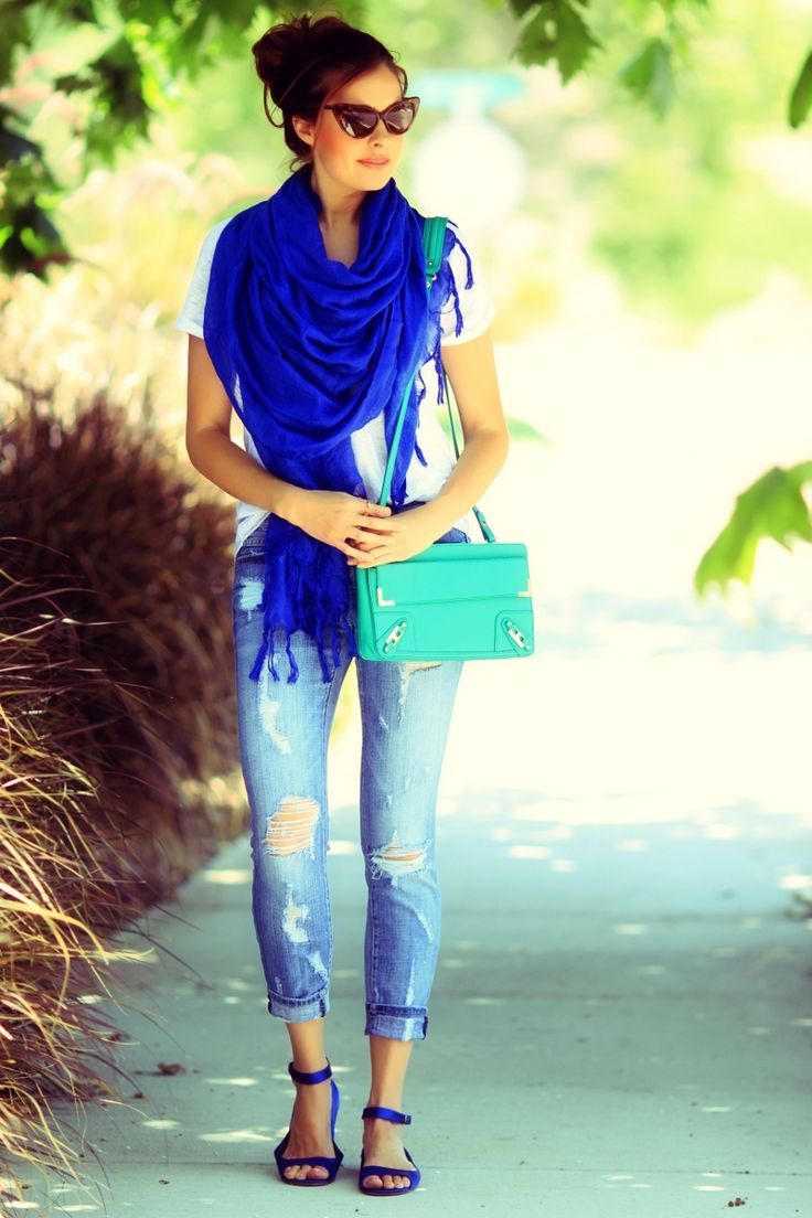 And with denim things, a cashmere scarf makes the look stylish and original.