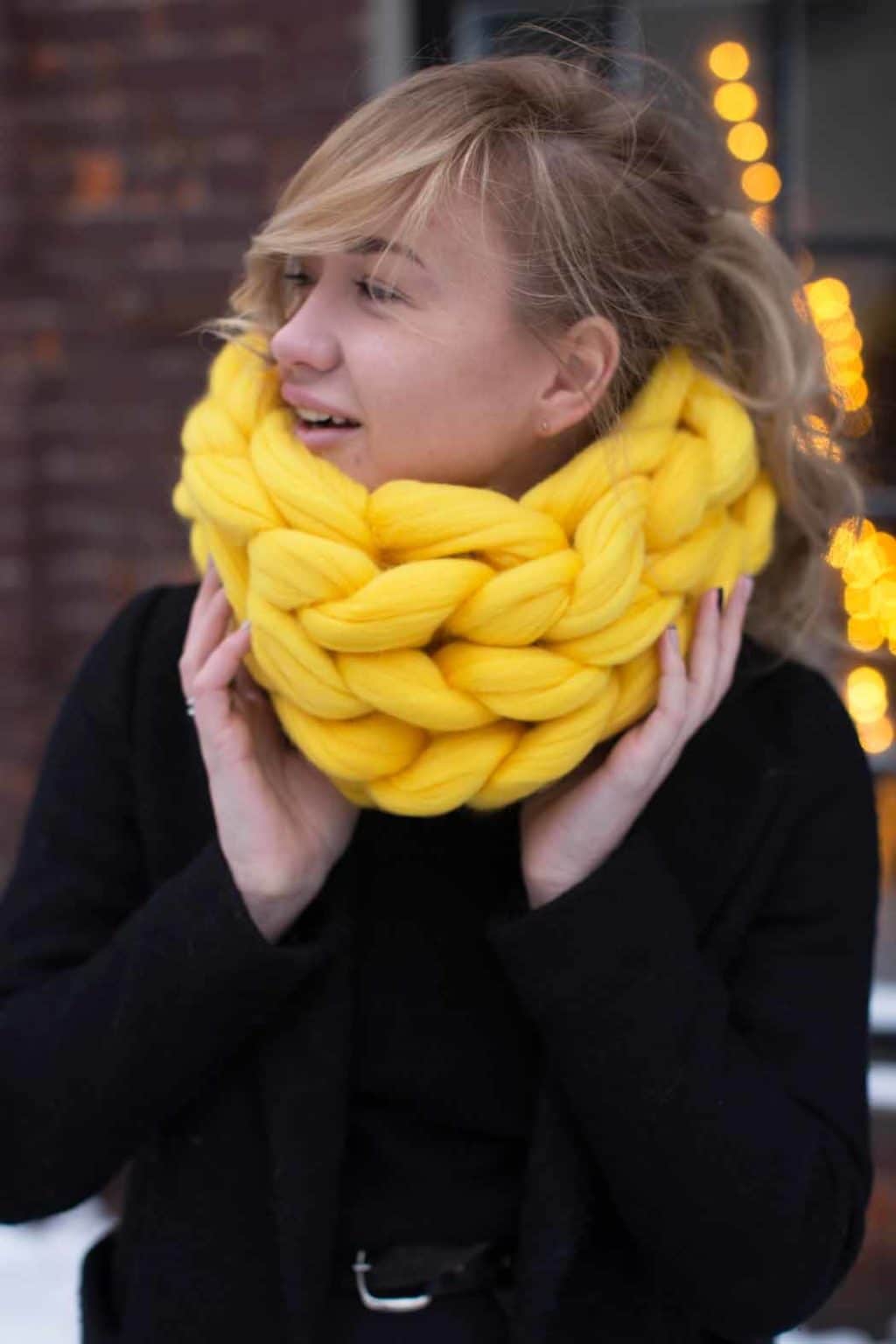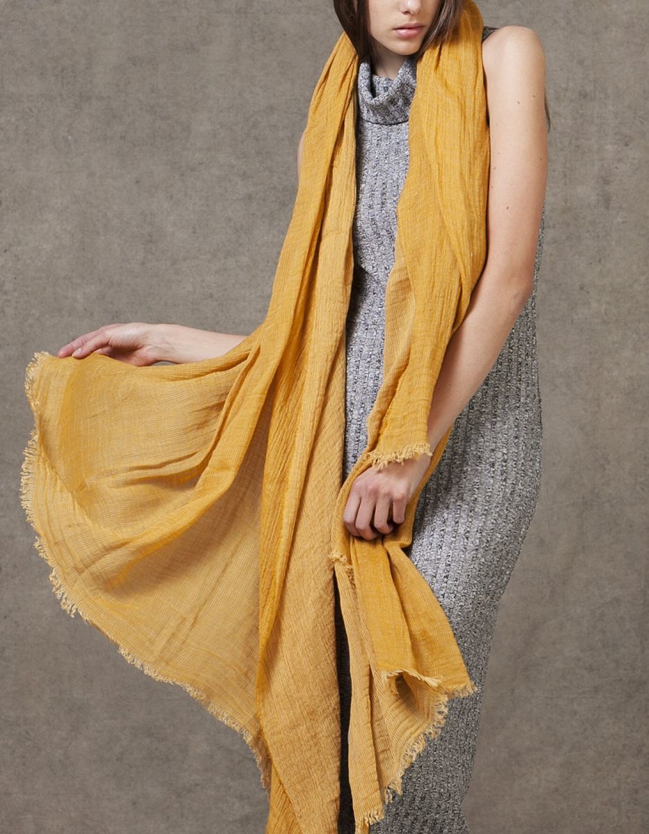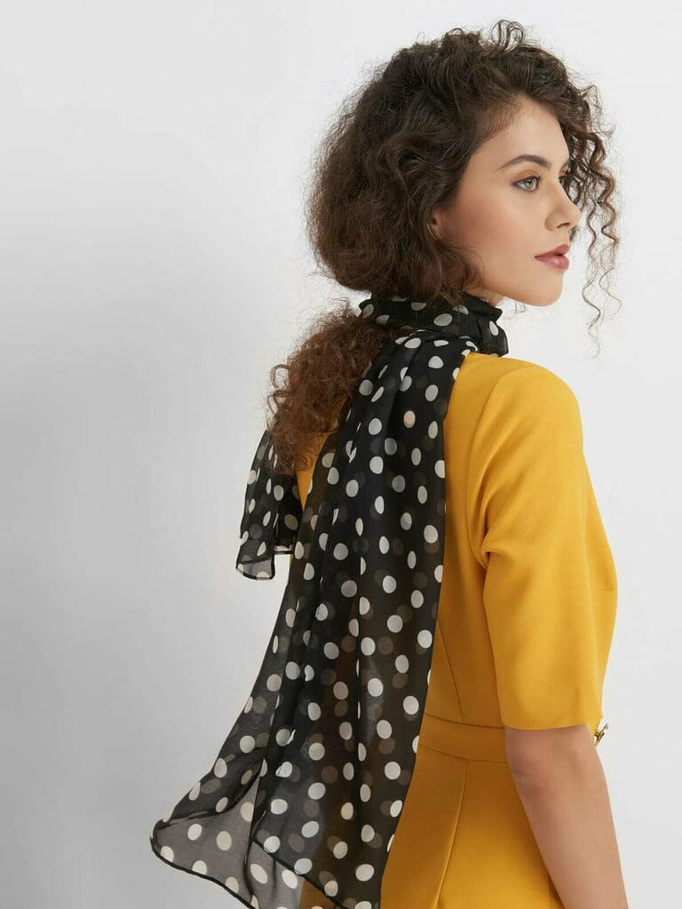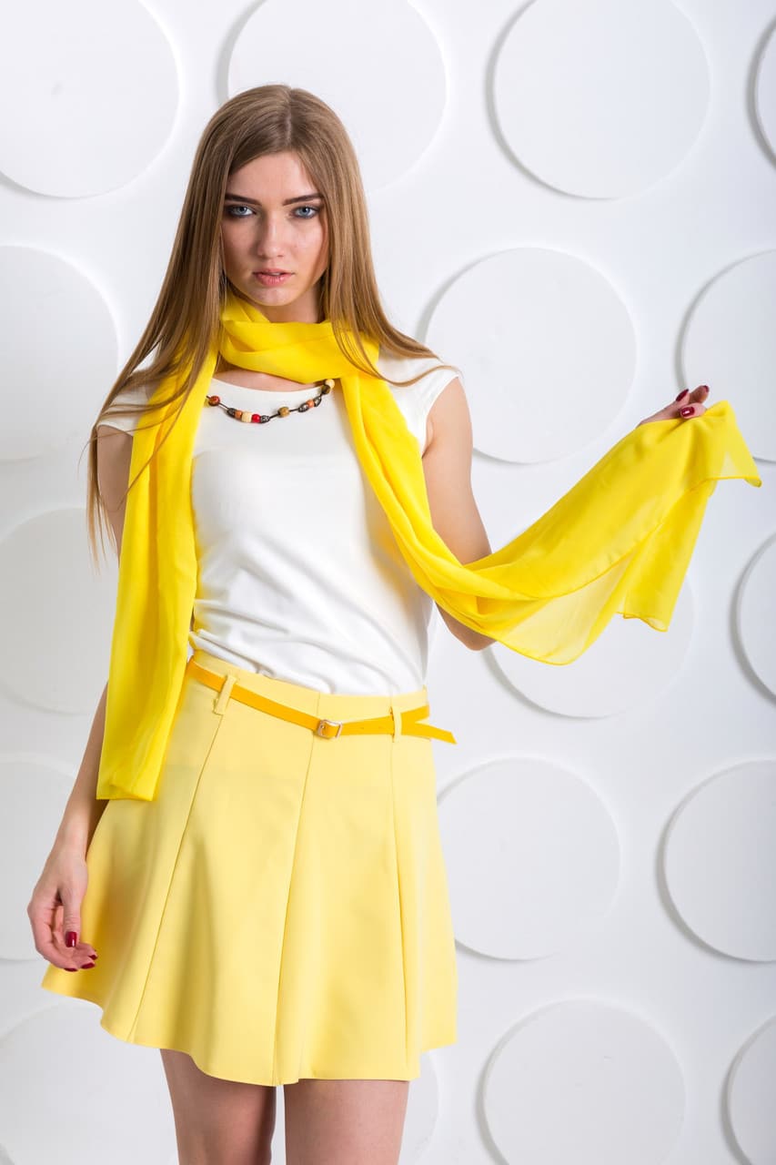 One of the extraordinary and cheerful shades is yellow; such a scarf will effectively bring bright colors and a playful mood into any image. After all, sometimes you really want to bring colors to your gray everyday life.