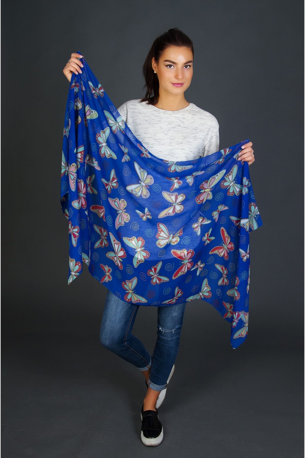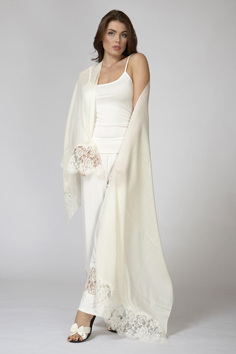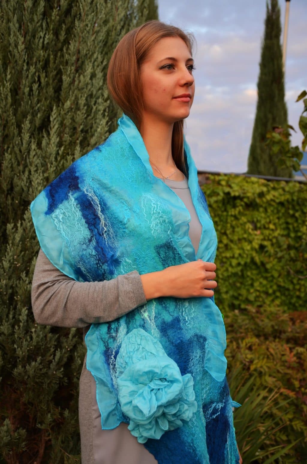 The shawl perfectly acts as a scarf, so tied around the neck, and dressed on shoulders.