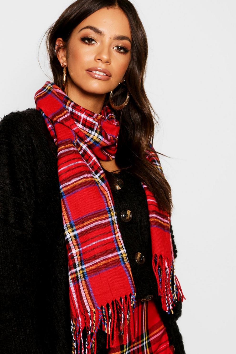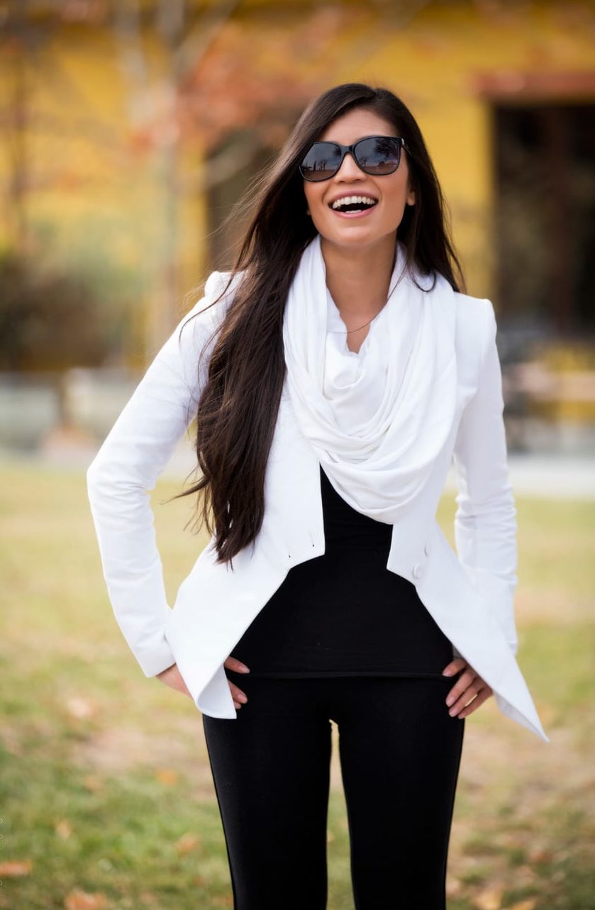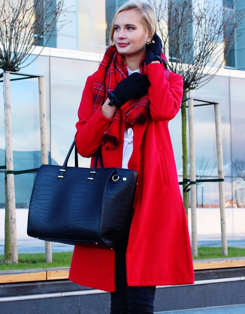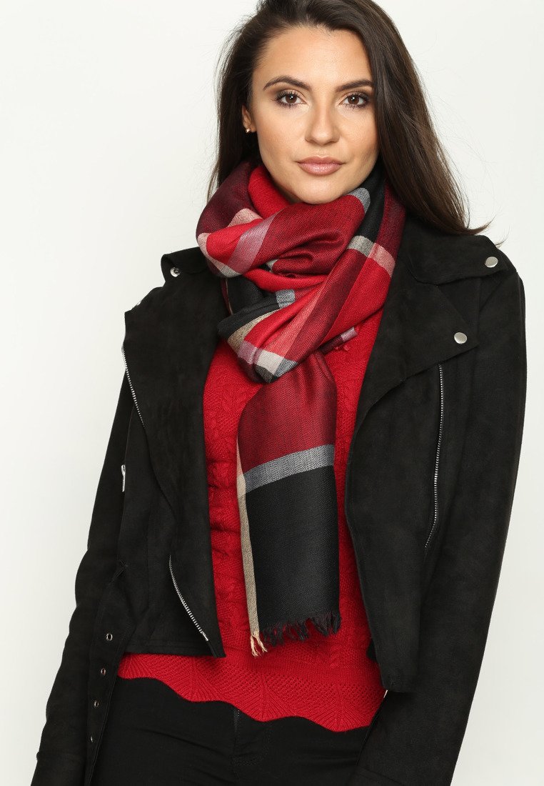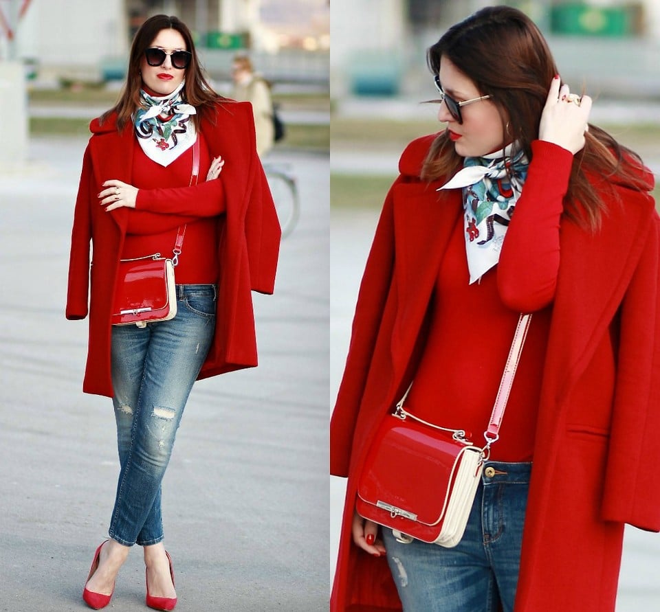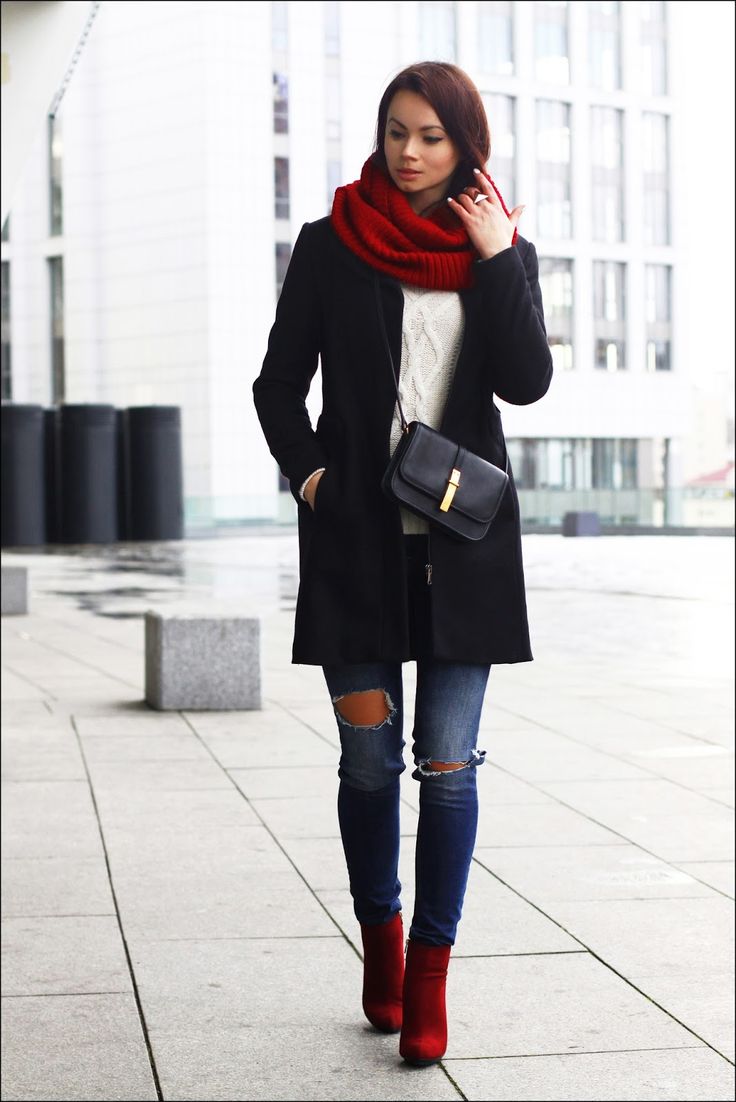 The combination of a red scarf with a black and white tint of clothing looks extravagant.