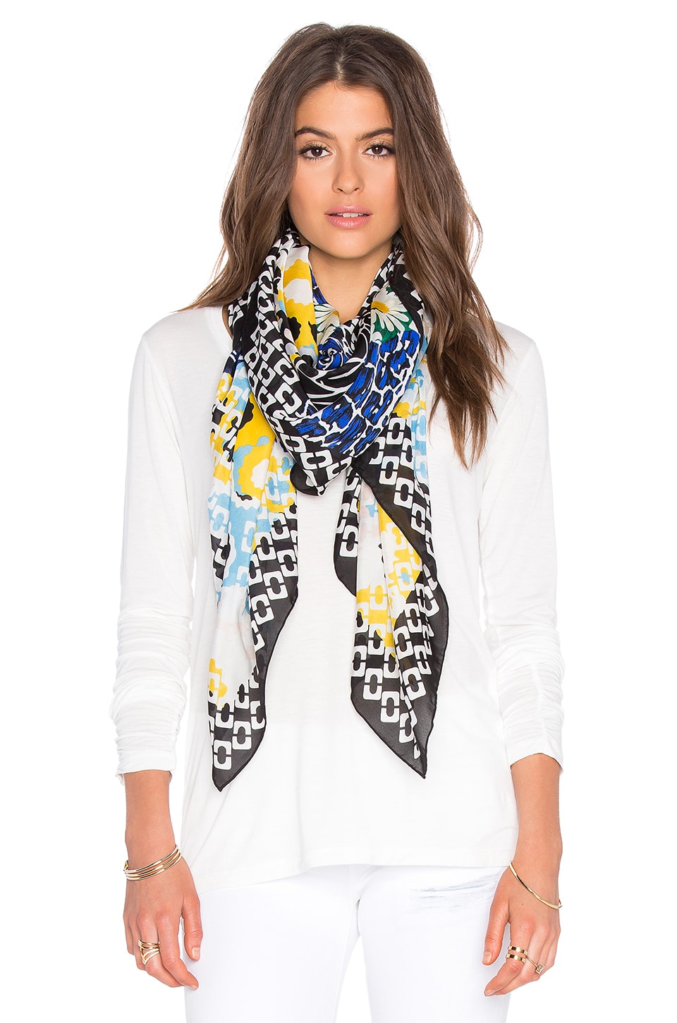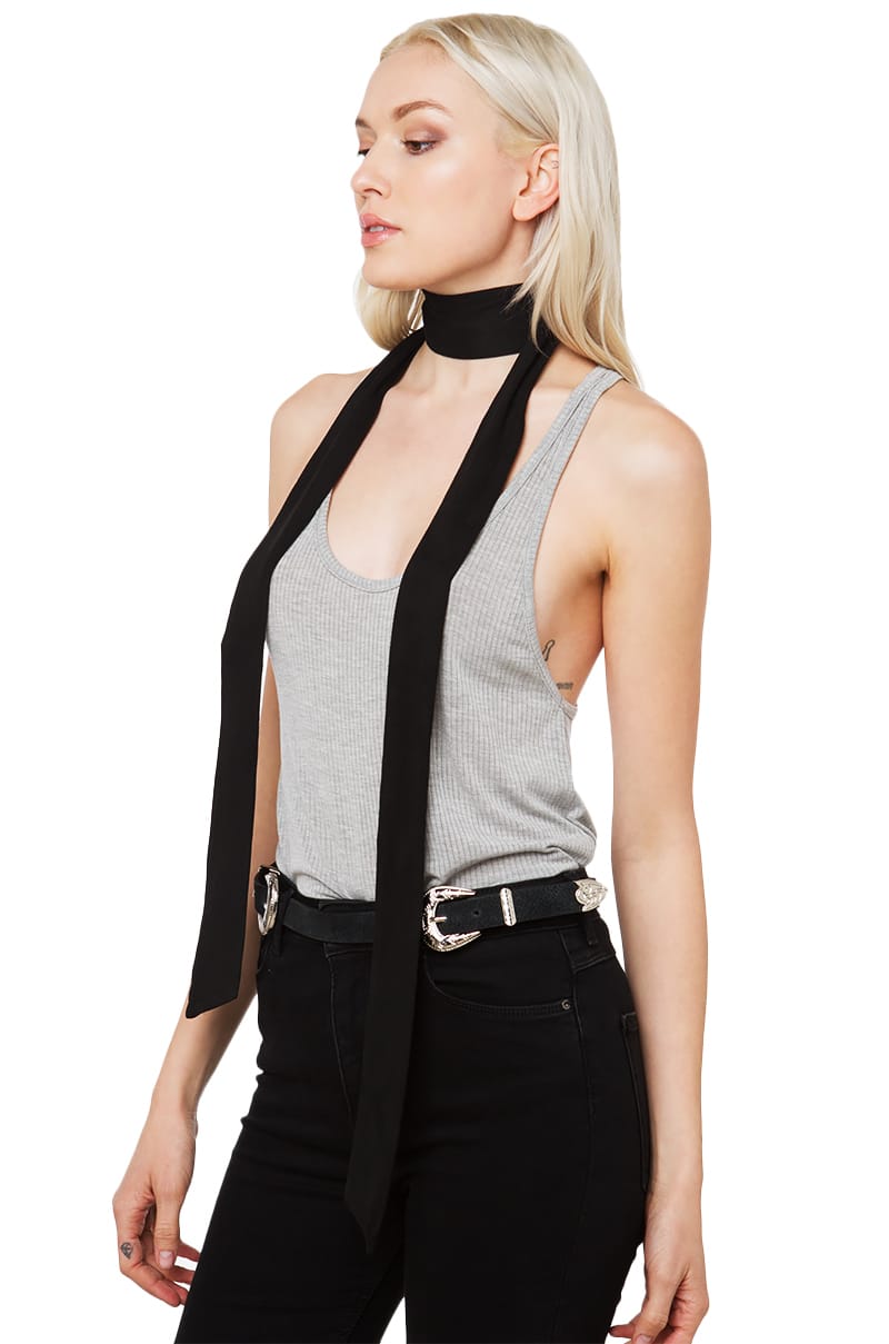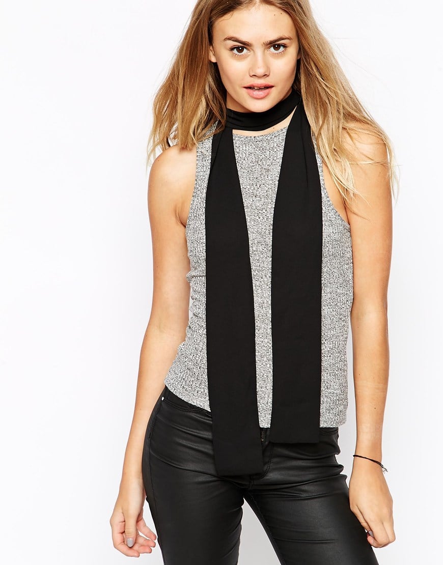 A black thin scarf looks extravagant in combination with t-shirts and jeans.
