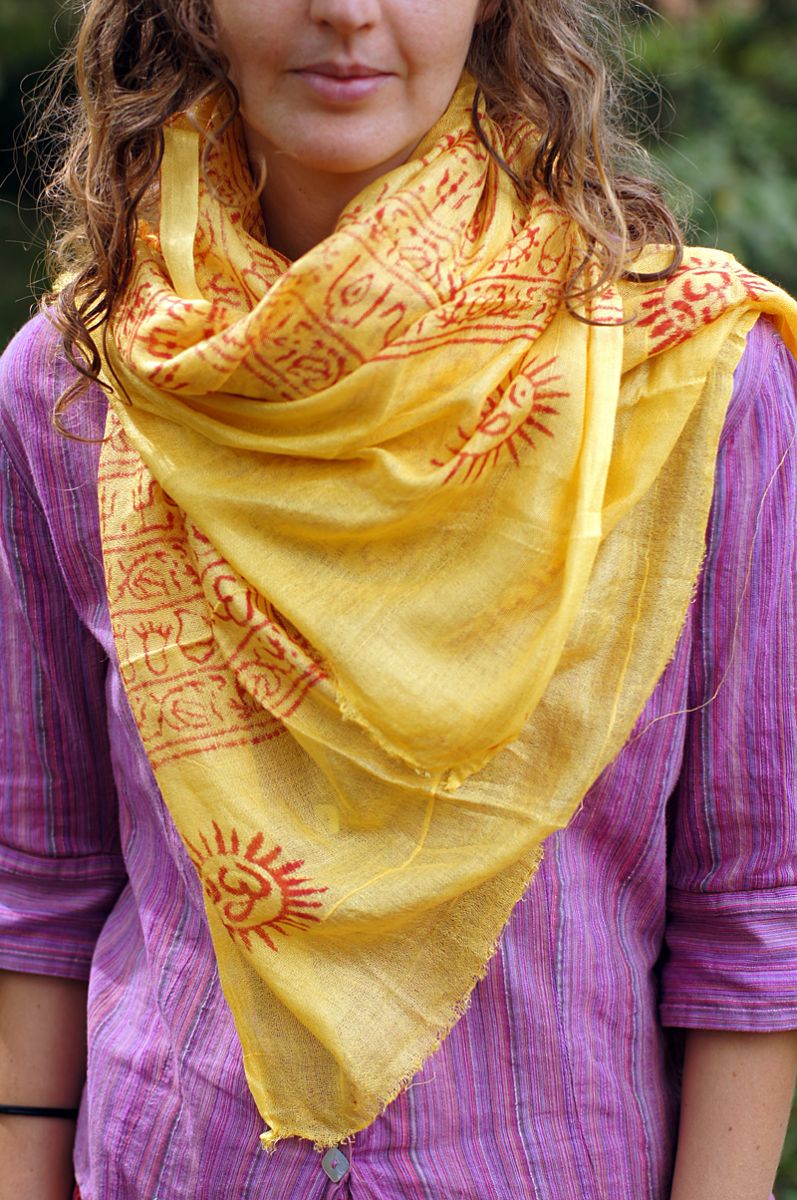 The yellow shade of the scarf stands out in contrast with the black color of the clothes. Adding brightness and uniqueness to the image.
