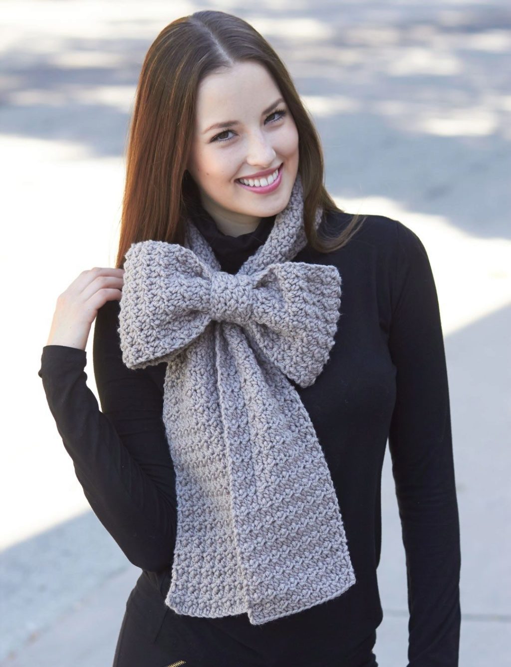 We will get an elegant bow by combining an image in beige shades and a yellow scarf knitted in an original way.
