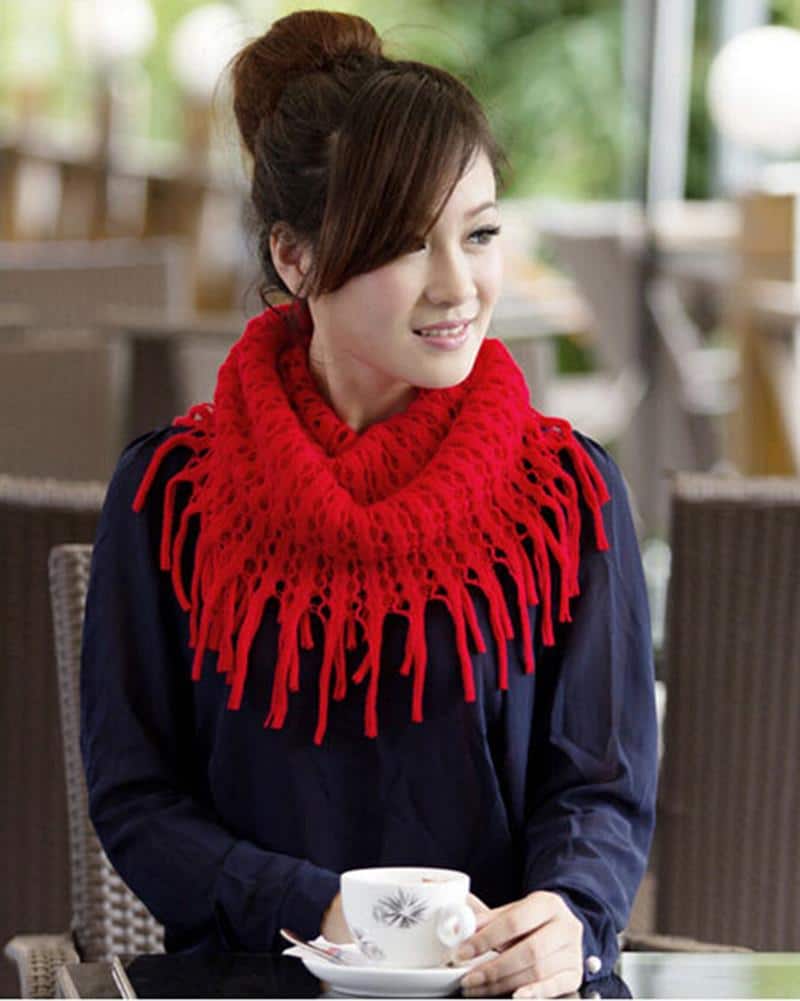 Naturally knitted scarf is a classic winter model. Having thrown over your shoulders and once circled around the neck and you will protect yourself from the common cold, and the edges of the scarf will gently hang in front.