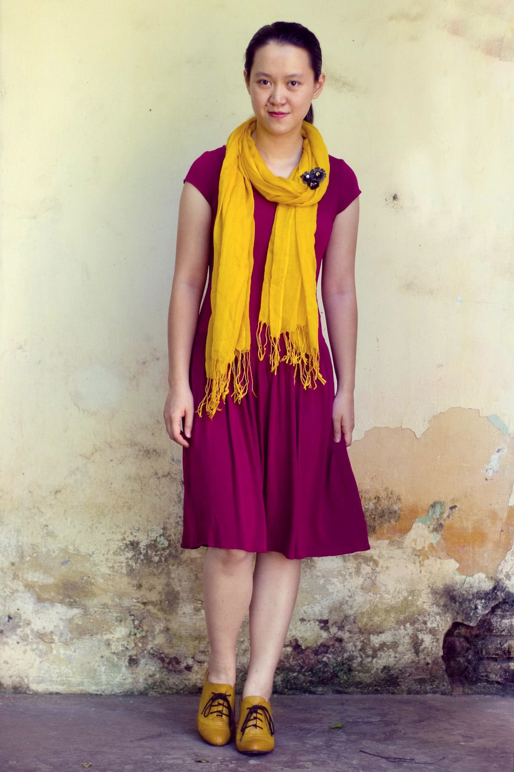 Thus, a raspberry dress, combined with a yellow scarf, looks original and extraordinary.