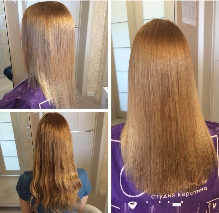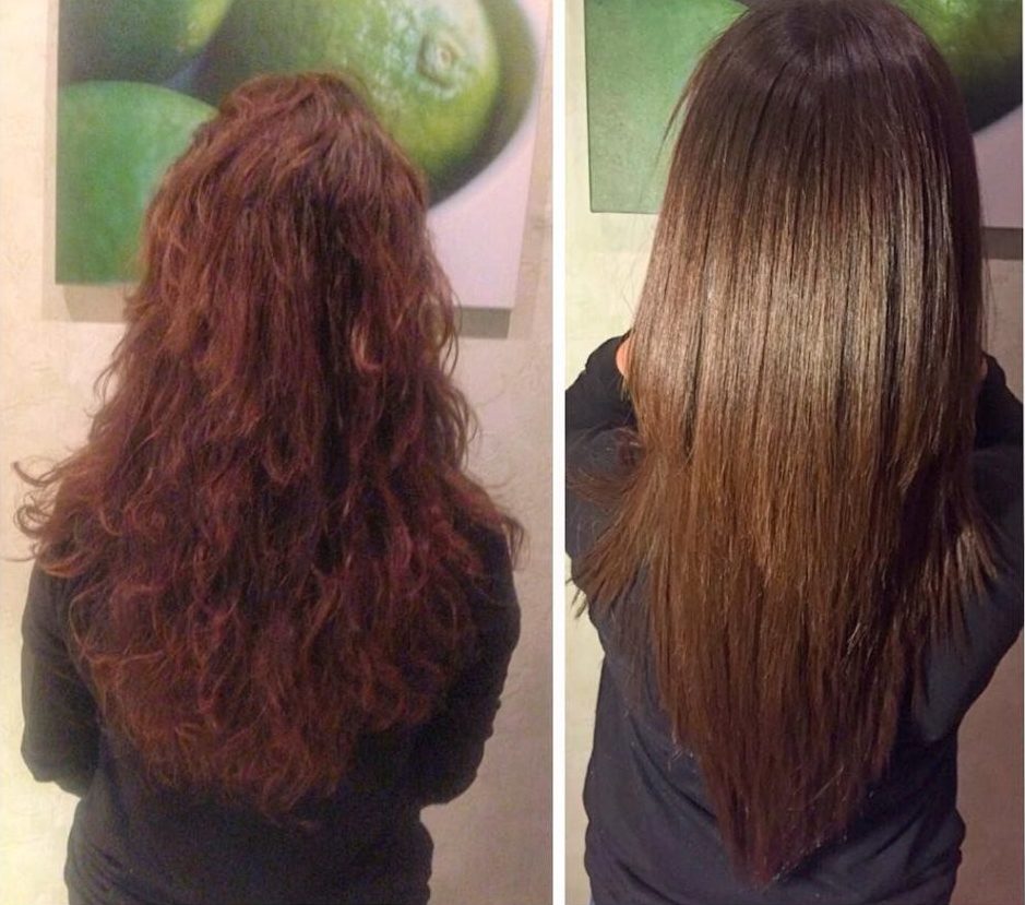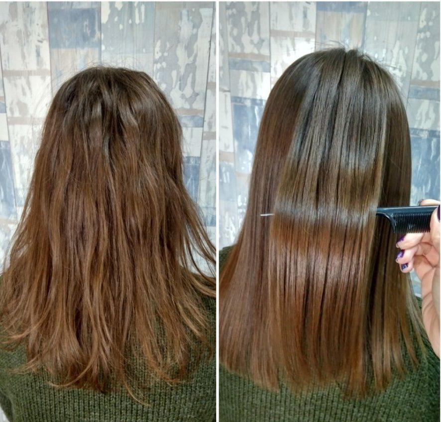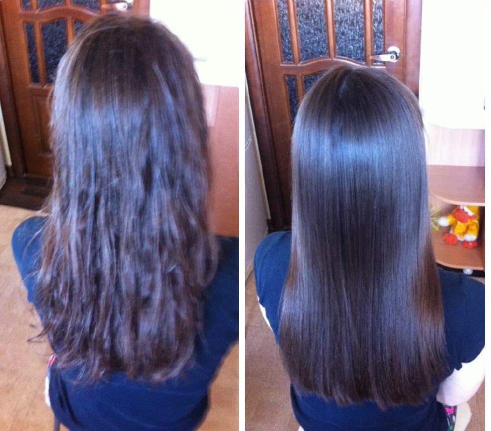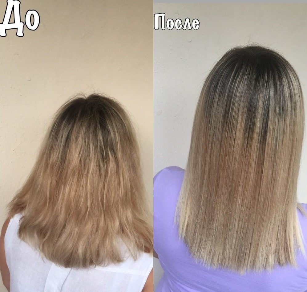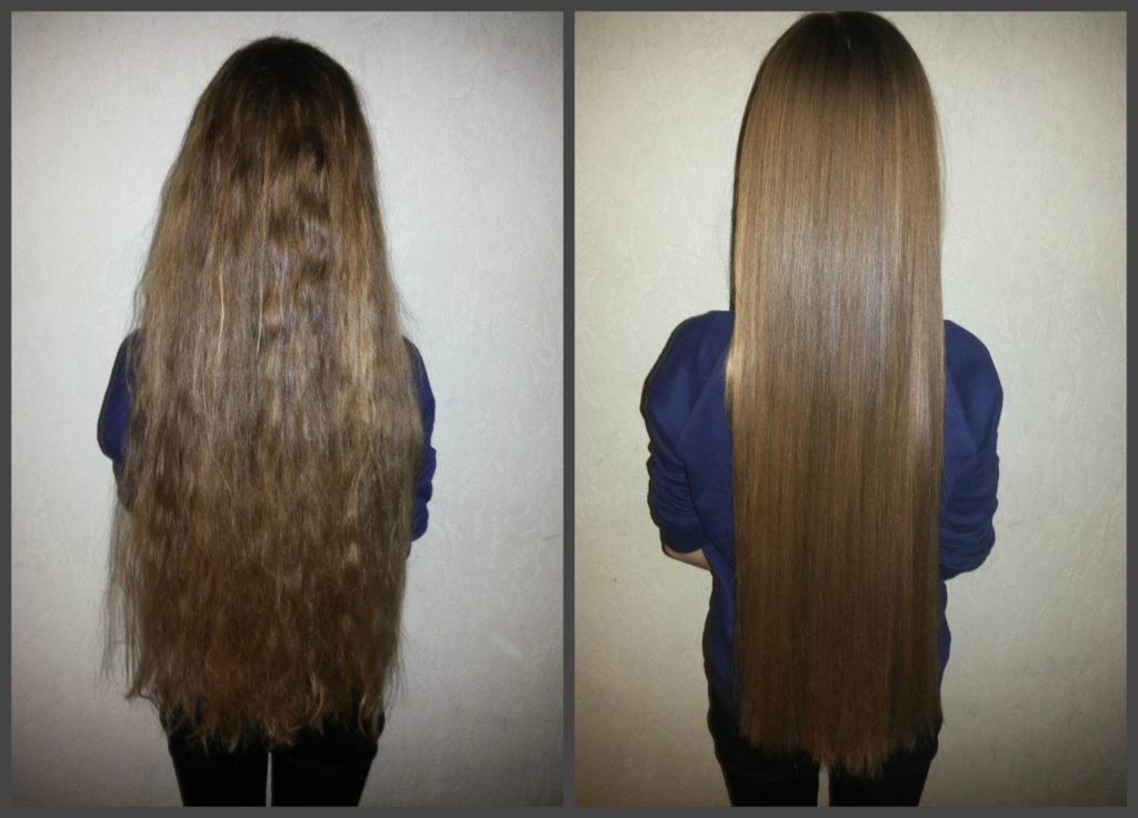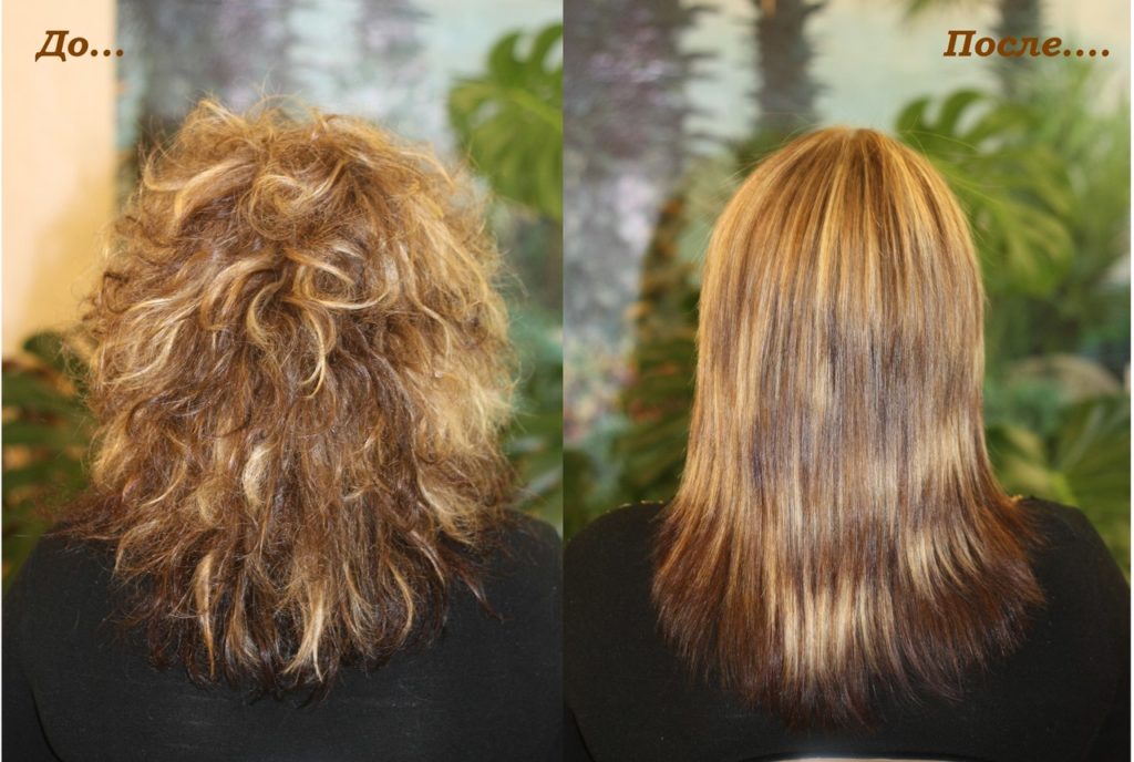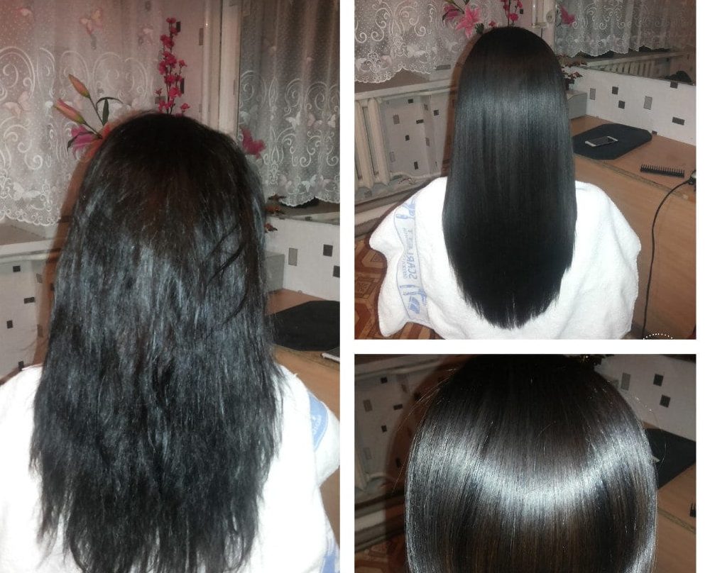 Thanks to the action of keratin, of which our hair consists of 90%, our hair is saturated with useful properties that help to straighten them in the future. And they get a smoother and silky look.