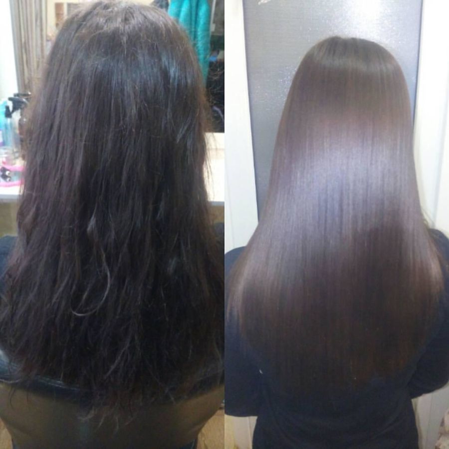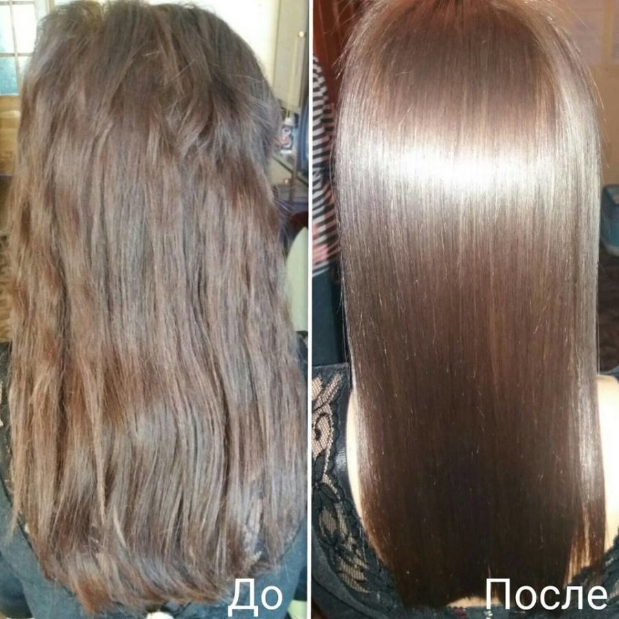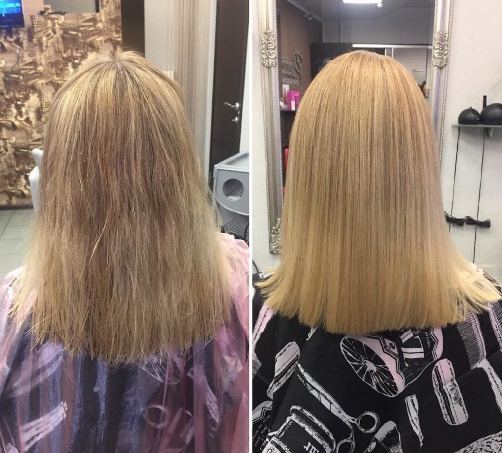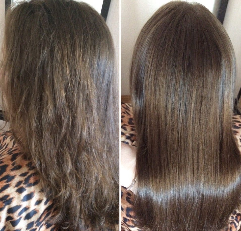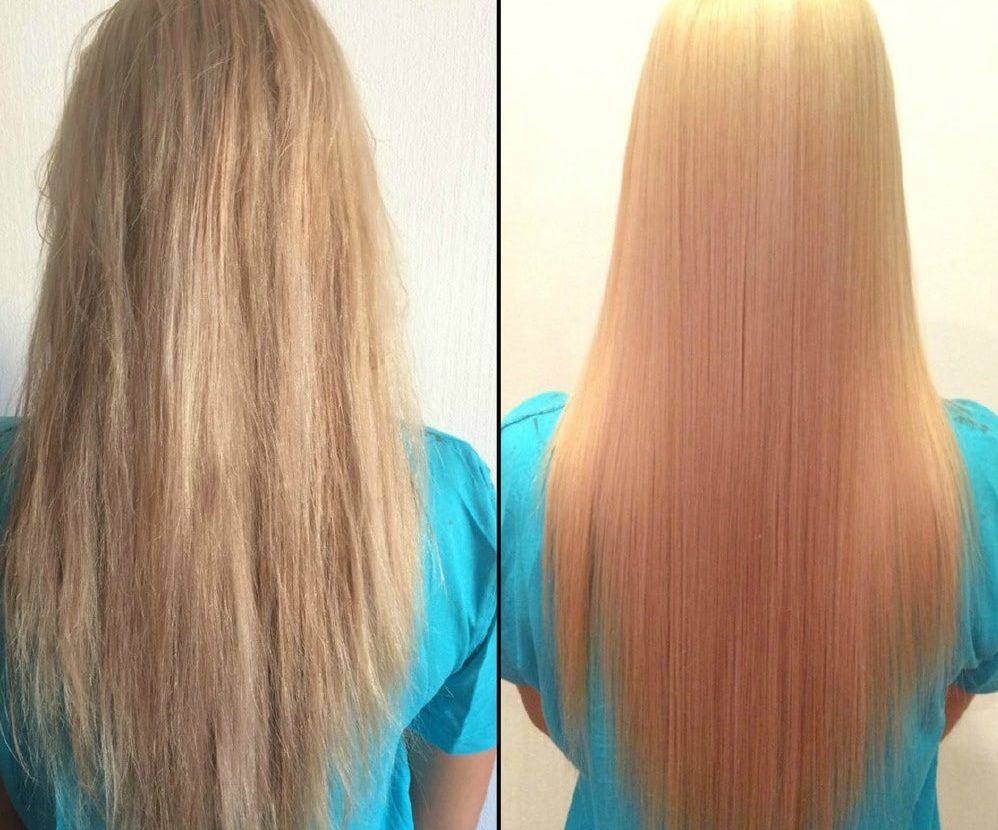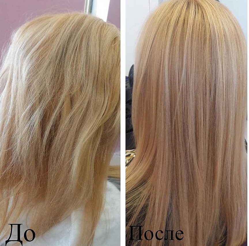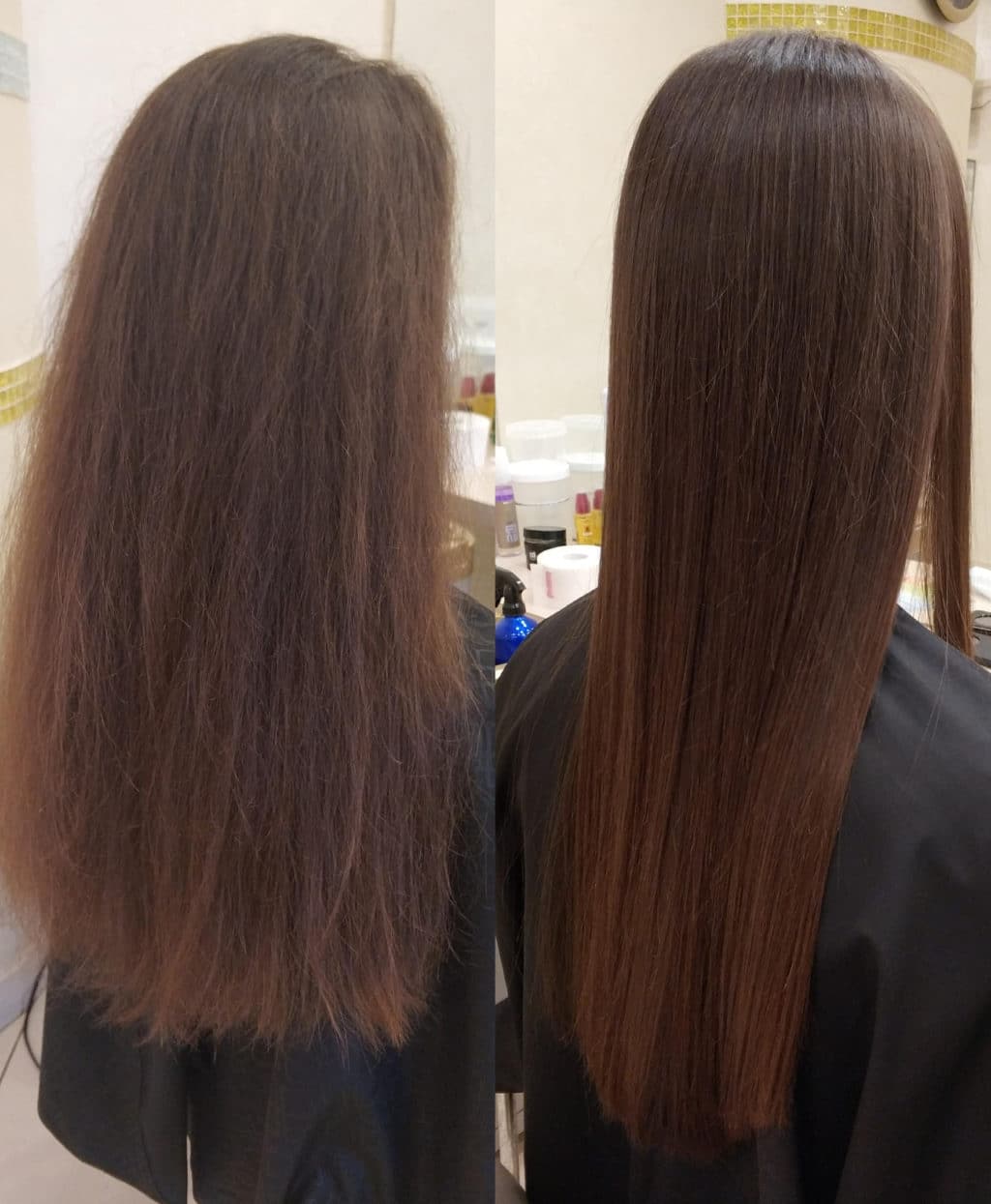Thanks to the action of keratin, of which our hair consists of 90%, our hair is saturated with useful properties that help to straighten them in the future. And they get a smoother and silky look.