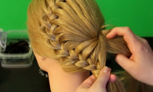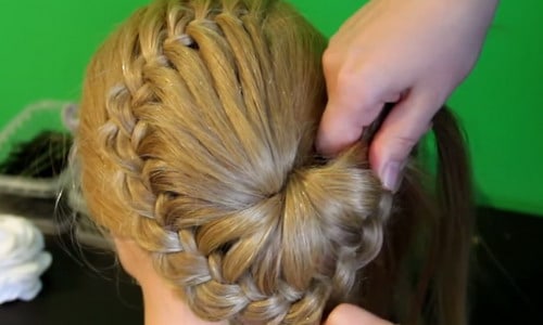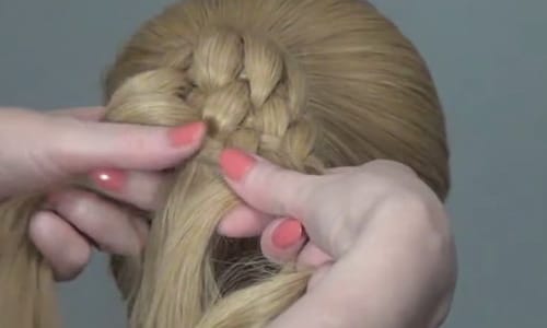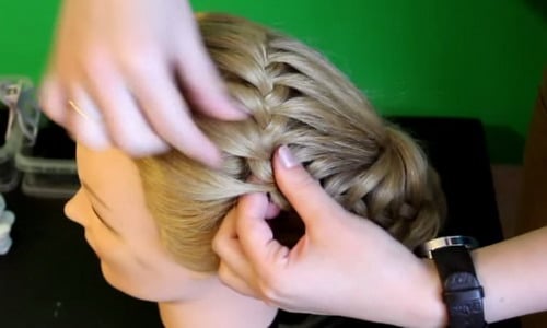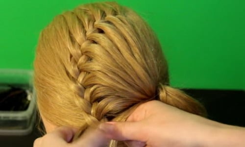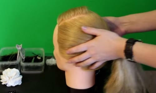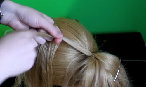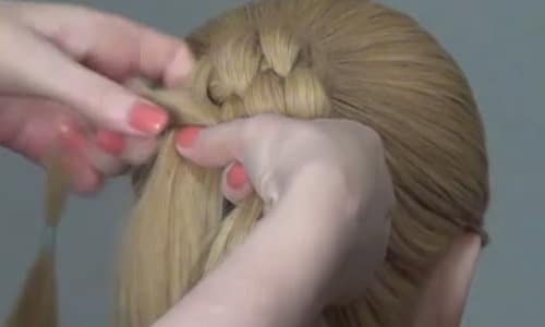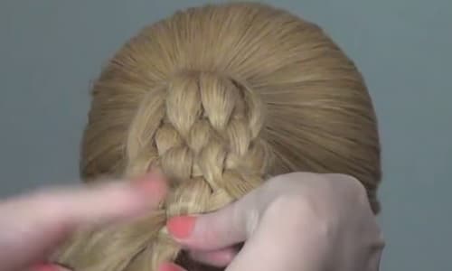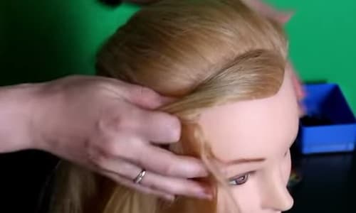 - All hair needs to be combed back and in the area of the temples take one lock (not very thick) and cross both locks together at the back of the head. You should have a right lock on top of the left.