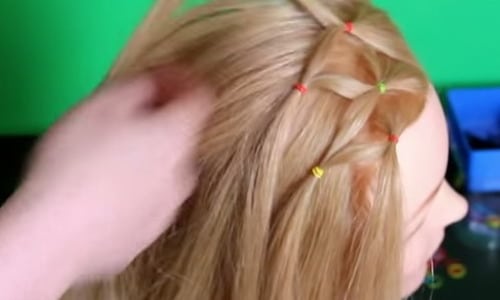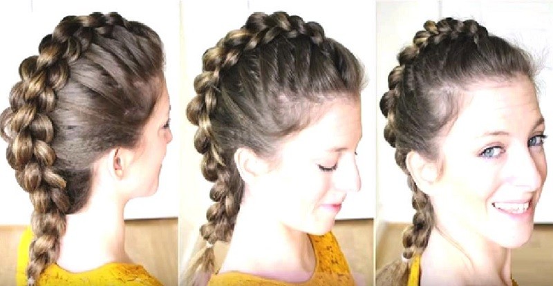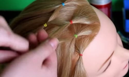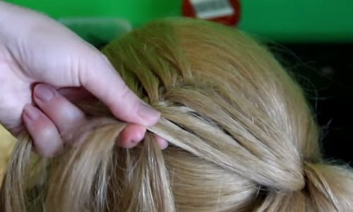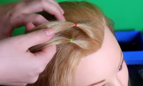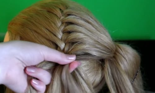 - Hair needs to be woven into a braid from two sides, and after horizontal parting, you switch to the usual weaving of three link braids. Fix the tip of the pigtail with an elastic band and proceed to the next step.