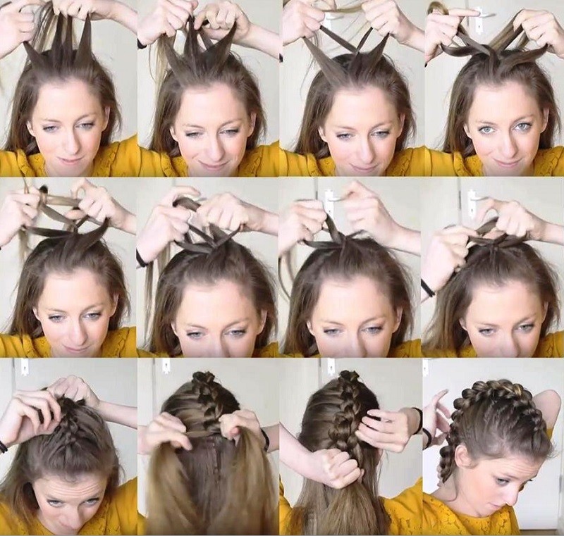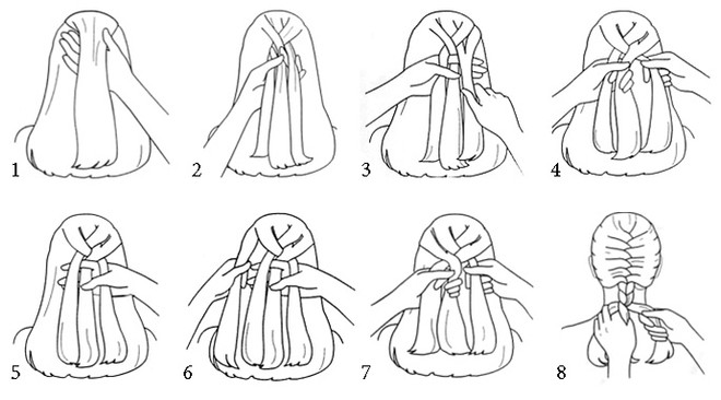 - Hair needs to be combed and starting from above, in the area of the parietal zone, take part of the hair. Divide them into three locks and shift the first to the central one, and then put the third on it.