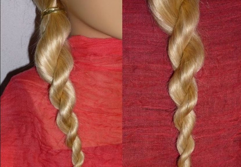 - After, divide it into two equal parts and twist each of them into a bundle. Twist the halves in one direction, so that in the end the braid turns out to be harmonious.