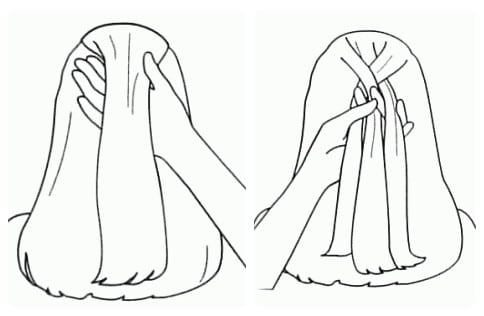 - Divide the hair into three parts: in the neck, a little higher, collect the hair and make a bun, and leave strands on the braids on the sides.