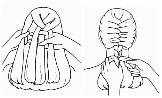 - To get started, take a strand in the region of the right ear and braid a standard pigtail. The main thing to remember is that the thickness of the strand will affect the thickness of the future pigtail. As well as the weaving method. If you pull your hair tightly, then the pigtail will turn out tighter and denser.