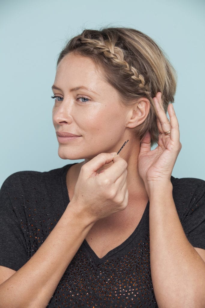 - When the pigtail is braided, then fix it with a flesh-colored elastic, and then pin it with an invisible one.