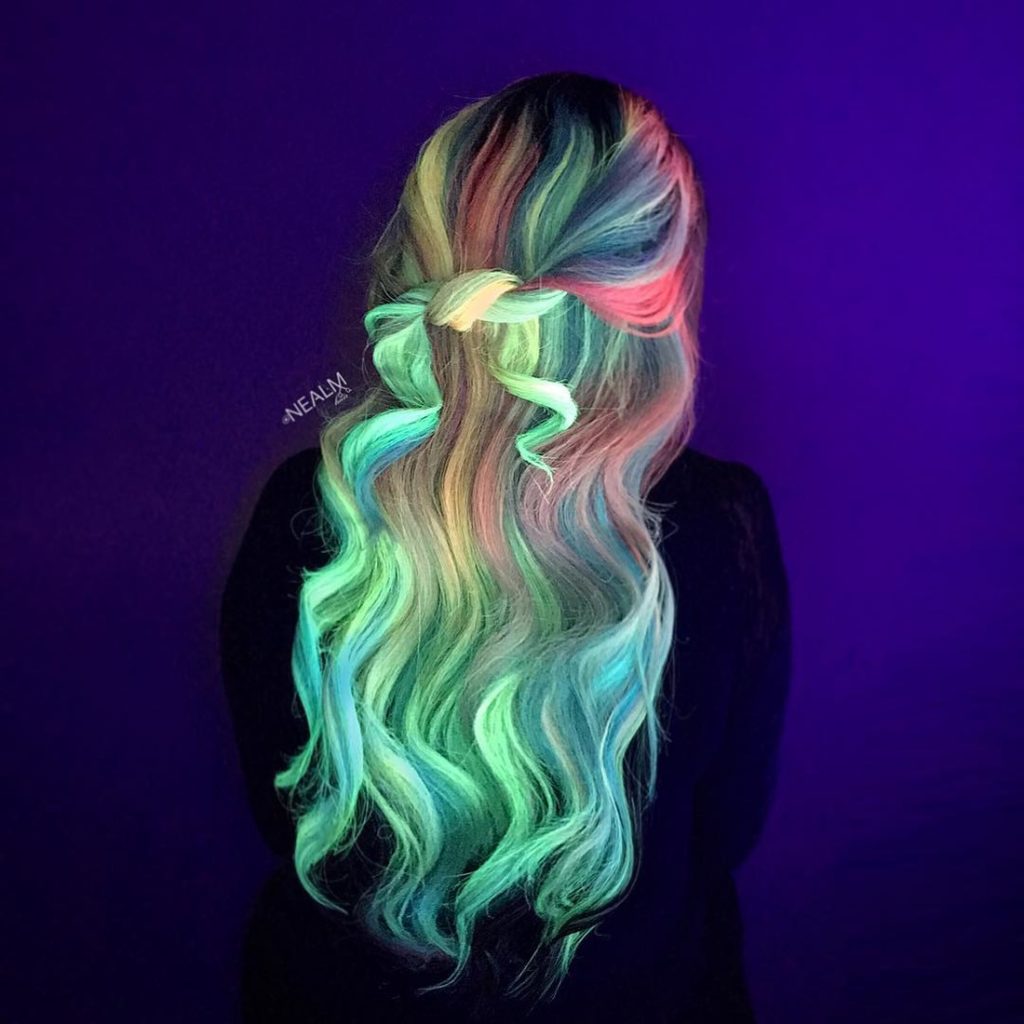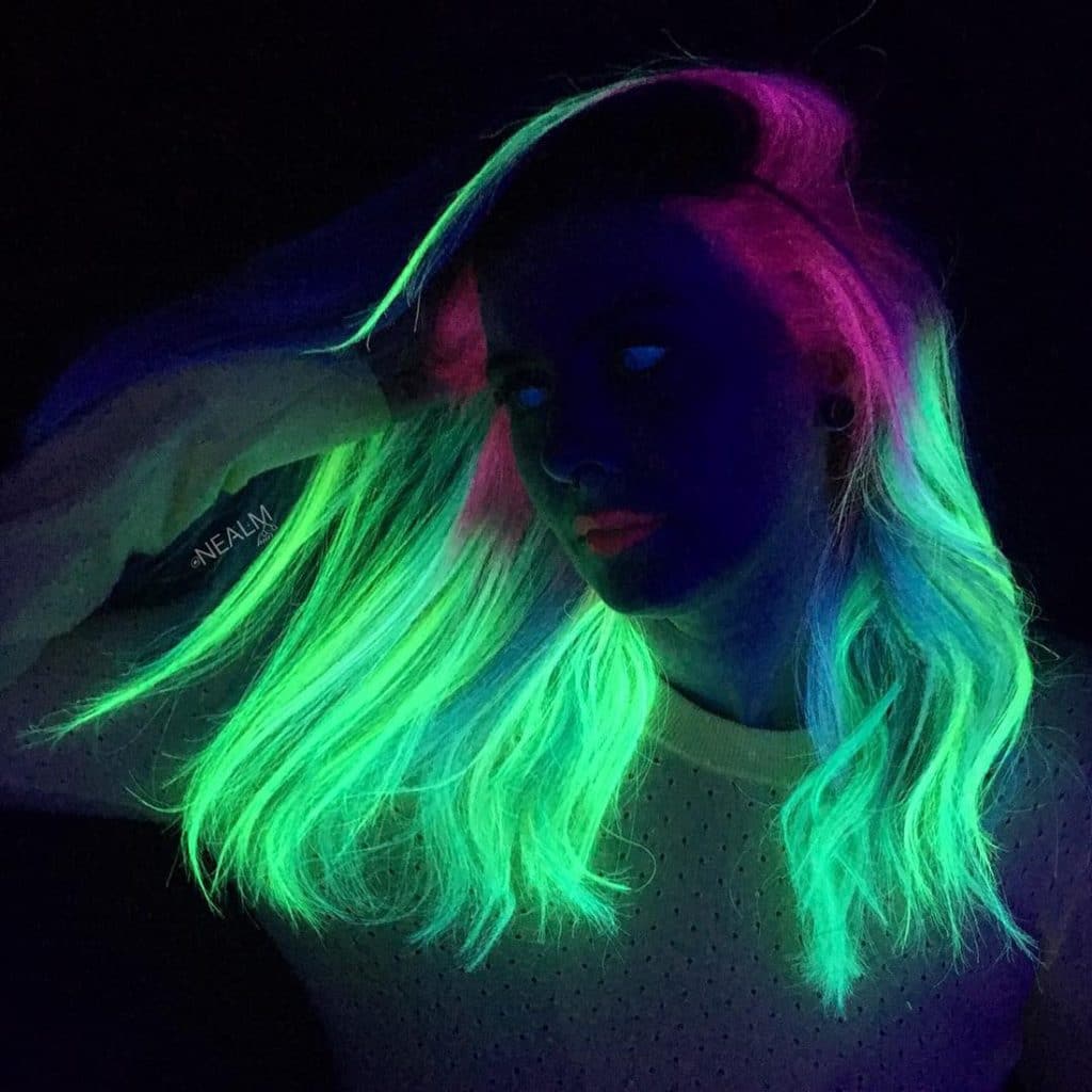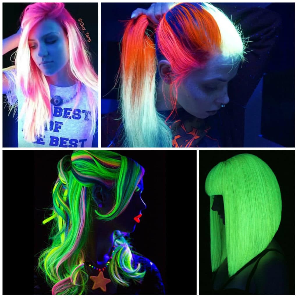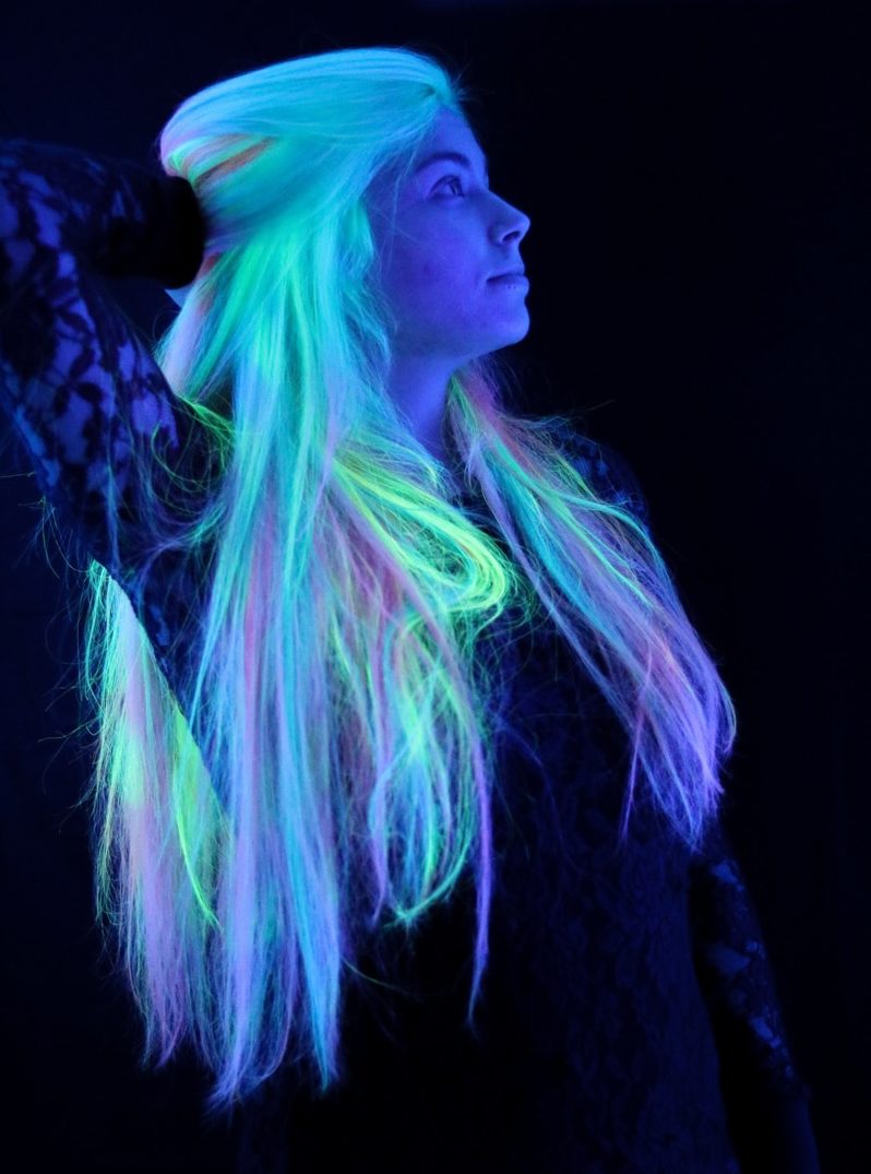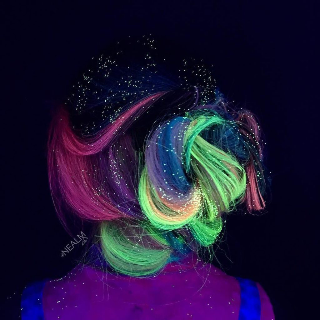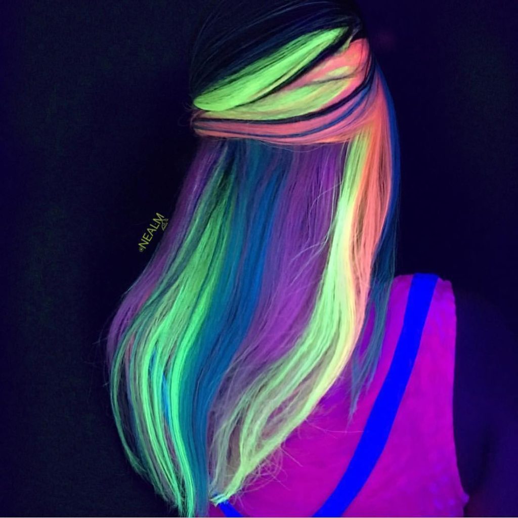 Neon-colored hair can be loosened, tied in a ponytail, bunched or braided with a regular braid. In any case, your hair will glow beautifully in the dark, and you will be perceived as an alien, but stylish guest.