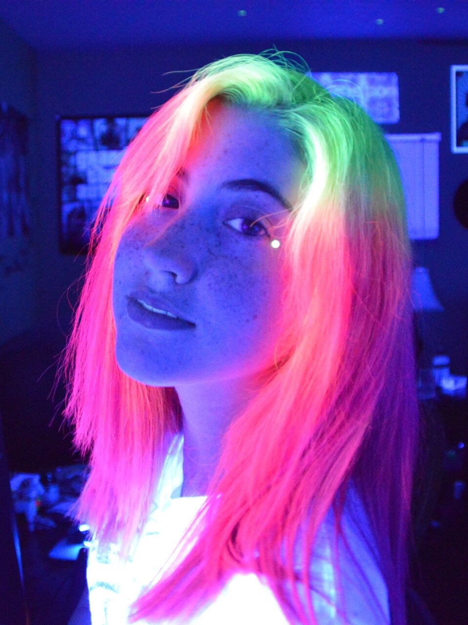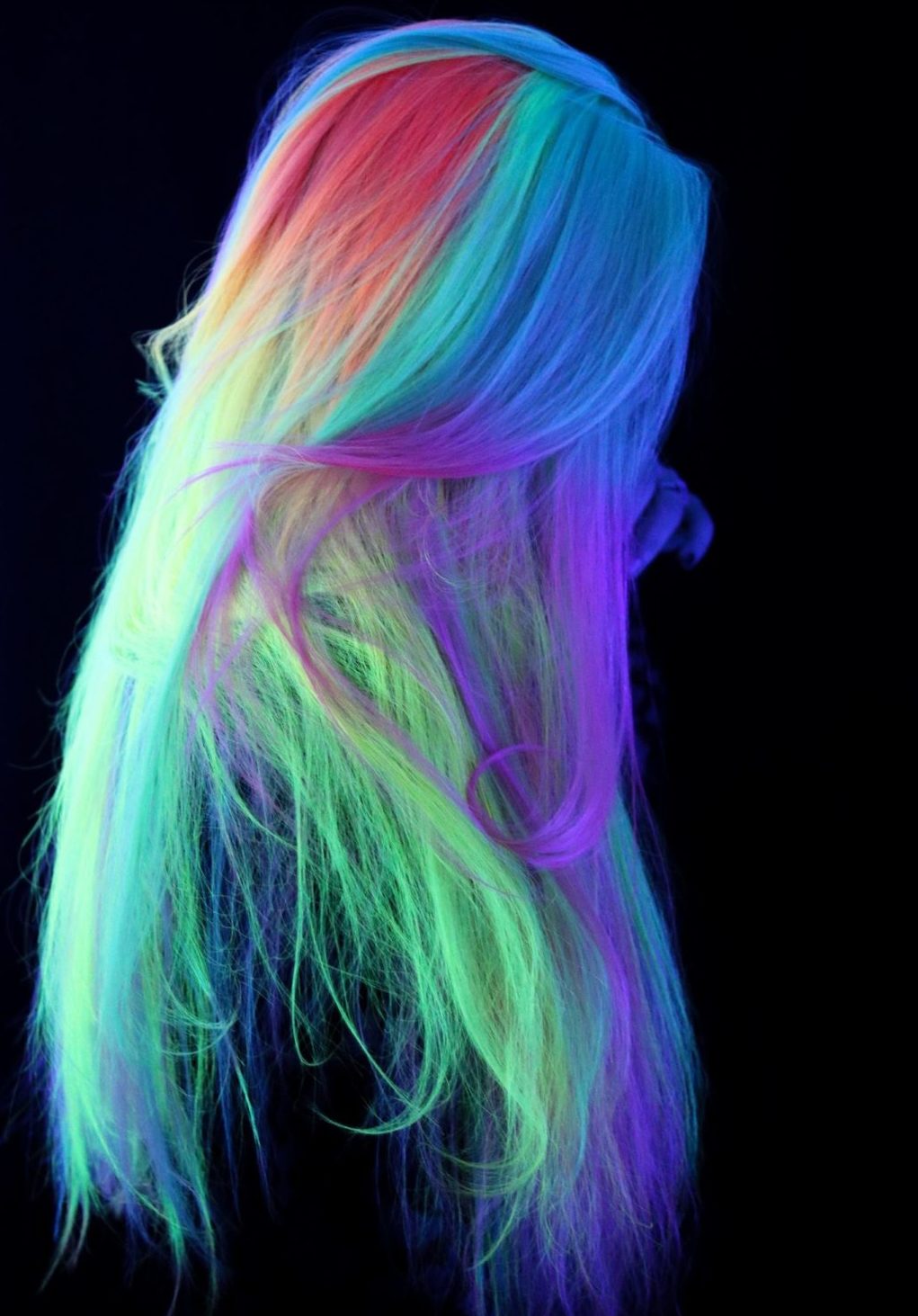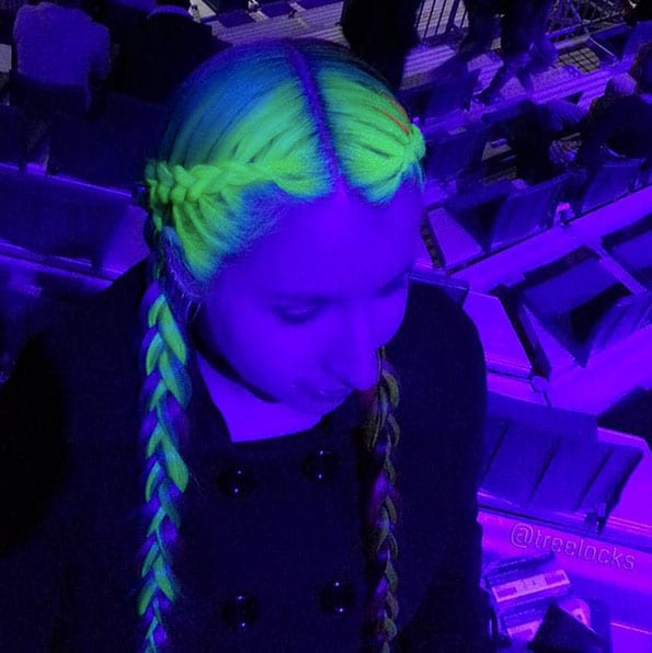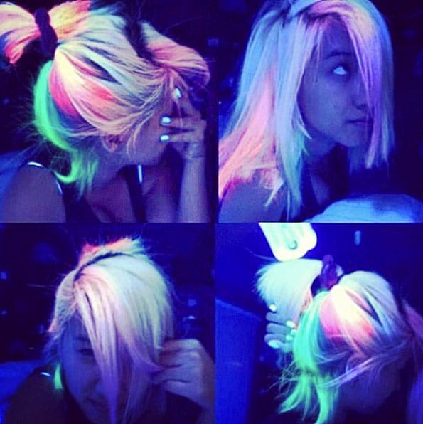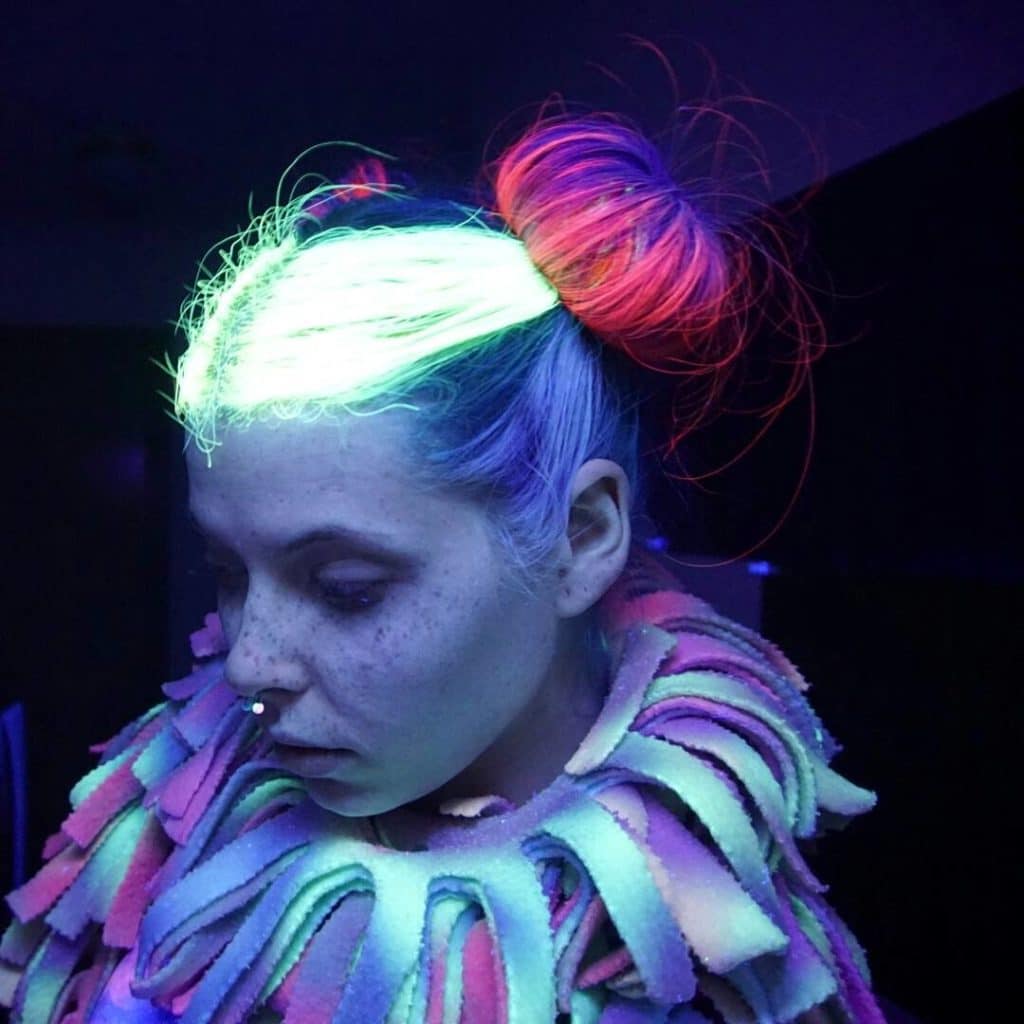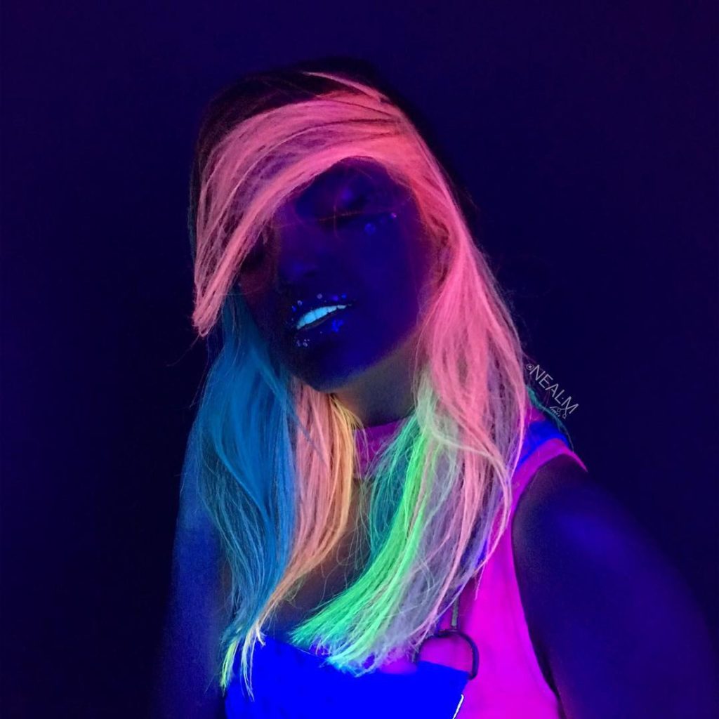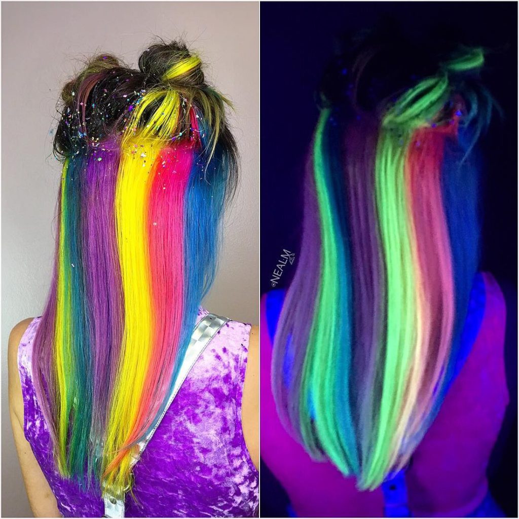 Neon-colored hair can be loosened, tied in a ponytail, bunched or braided with a regular braid. In any case, your hair will glow beautifully in the dark, and you will be perceived as an alien, but stylish guest.