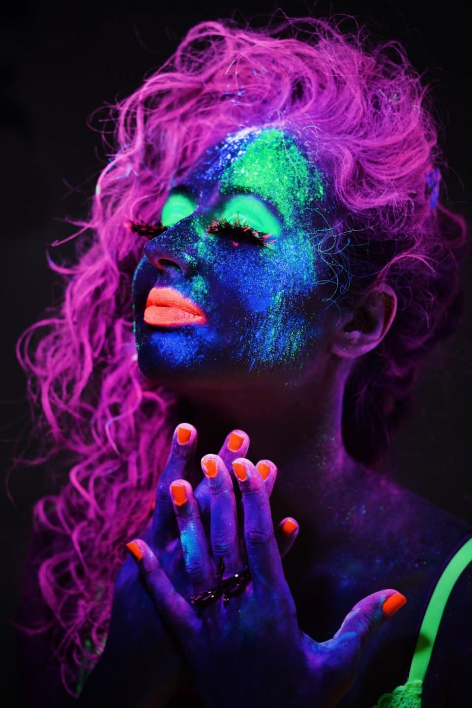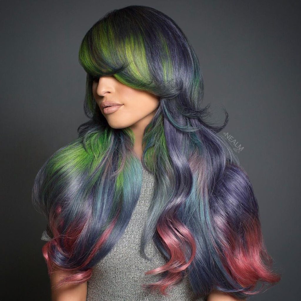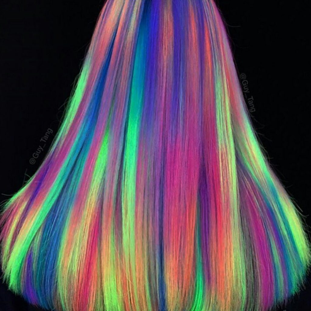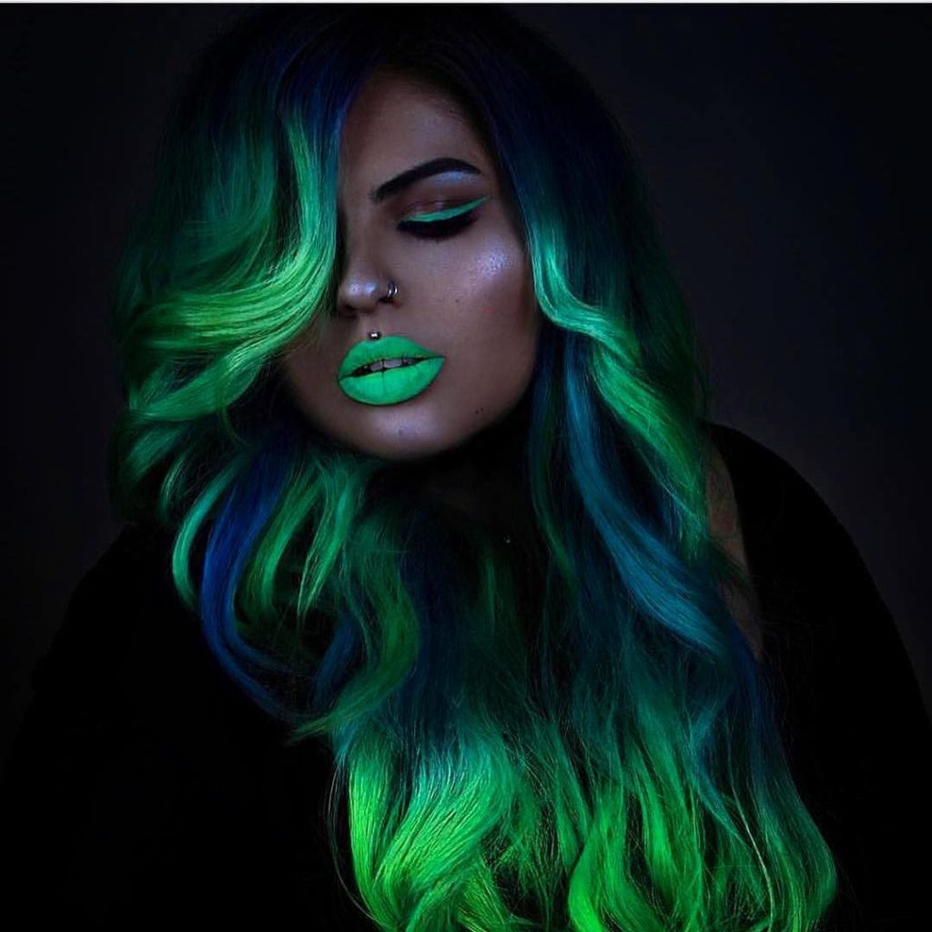 Neon coloring looks like a usual multi-colored coloring in the afternoon. It can be any color of the rainbow, or multi-colored ombre. No one will guess that such paints can glow at night and in ultraviolet light.