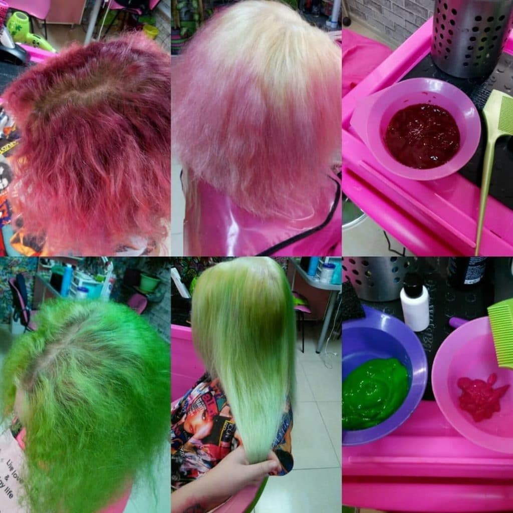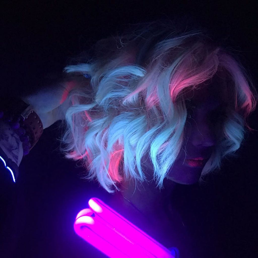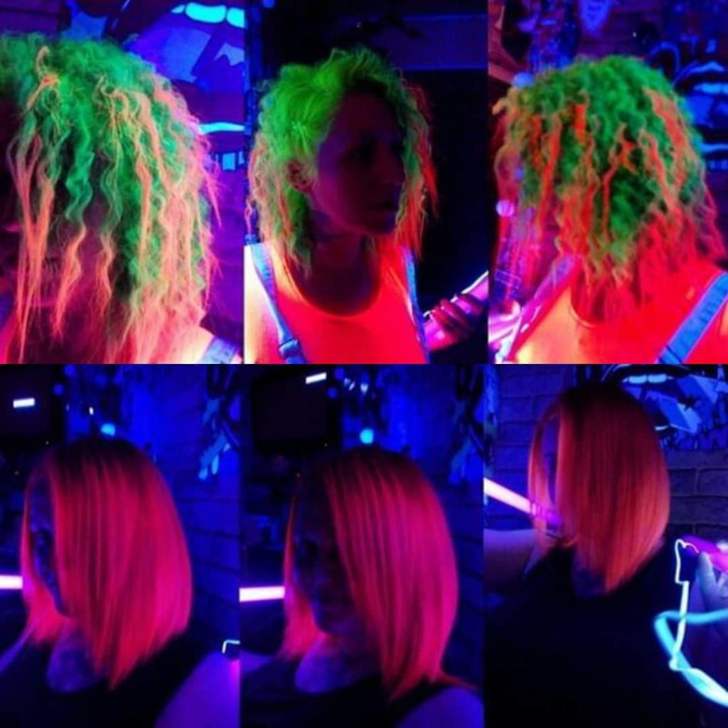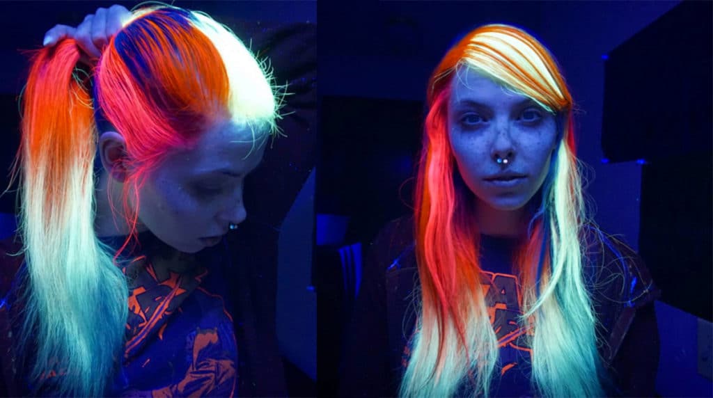 Neon dyeing does not stain hair as much as regular dye. In its property, it is similar to the color sprays used in the stencil technique, only with the difference that this paint glows in the dark.