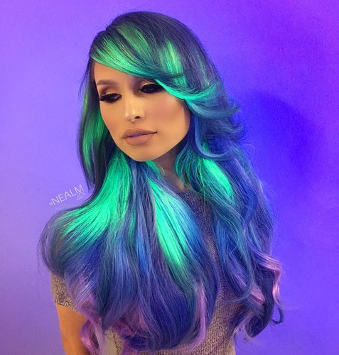 If you have long wanted to become the queen of the dance floor, then with such hair coloring, it's time to visit a nightclub. Believe me, you will be a star. Many girls, in combination with neon staining, also select neon cosmetics. It can be lipstick, mascara, eye shadow or a neon eyeliner. And of course, neon polish is applied to the nails.