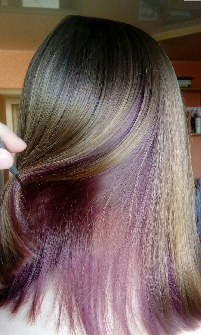 Hidden dyeing occurs in such a way that in the dissolved form, your hair has a normal, native hair color. But if you lift the top layer, you can find hair under it completely different color.