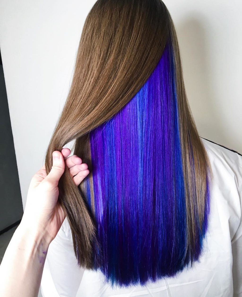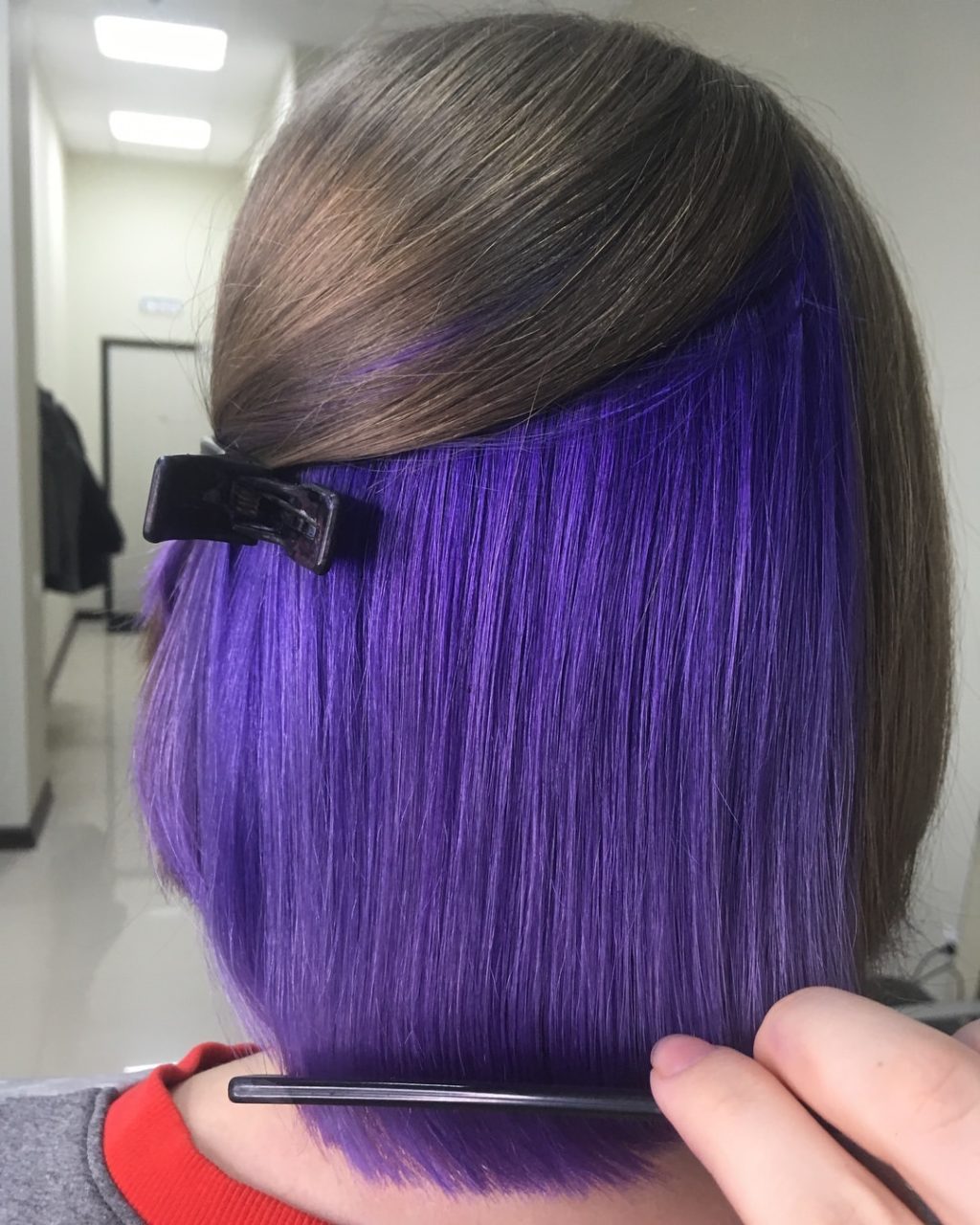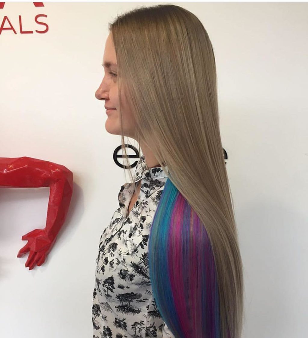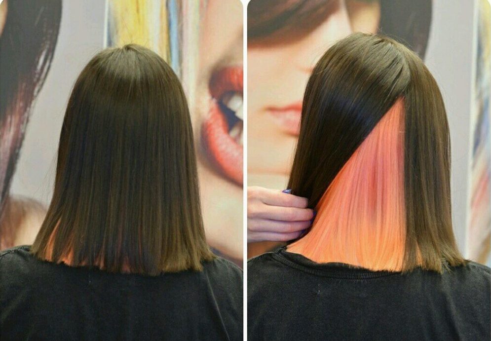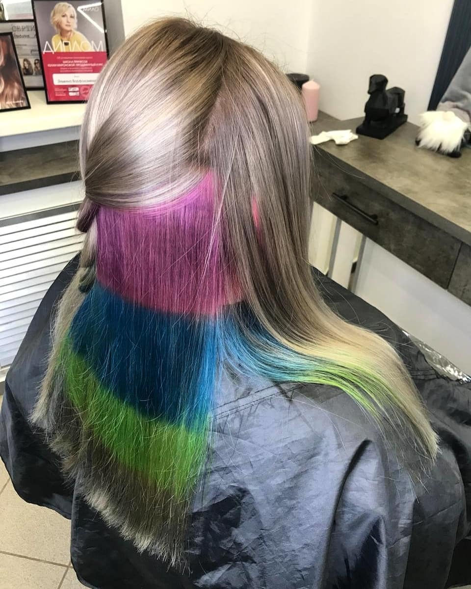 Hidden hair coloring dyes the lower occipital part of the hair, in different bright colors. It can be, like one bright color, or a set of multi-colored strands. After all, the main advantage in this type of coloring is that any crazy colors will not be visible immediately, but only when you yourself want it.