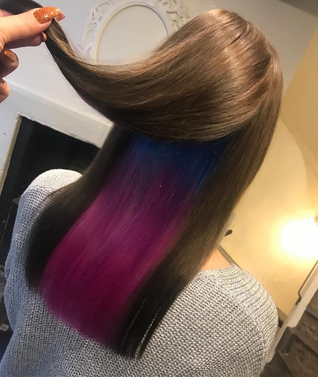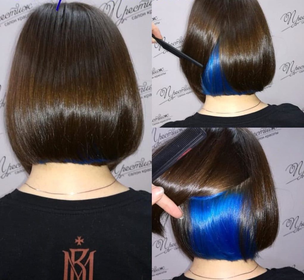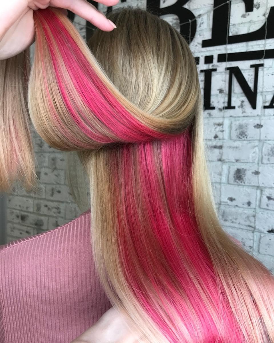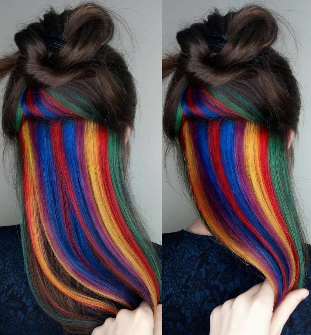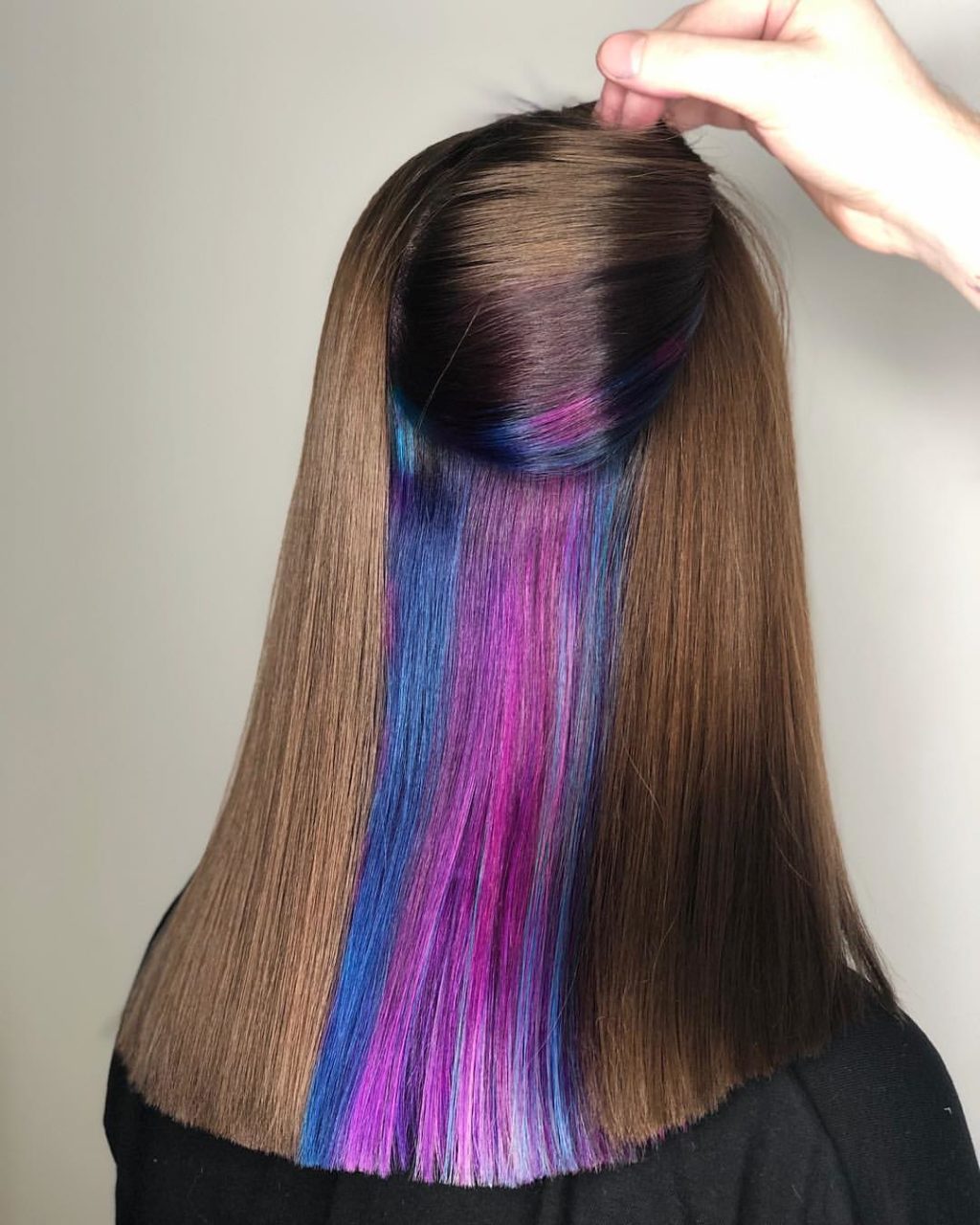 Hidden hair coloring dyes the lower occipital part of the hair, in different bright colors. It can be, like one bright color, or a set of multi-colored strands. After all, the main advantage in this type of coloring is that any crazy colors will not be visible immediately, but only when you yourself want it.
