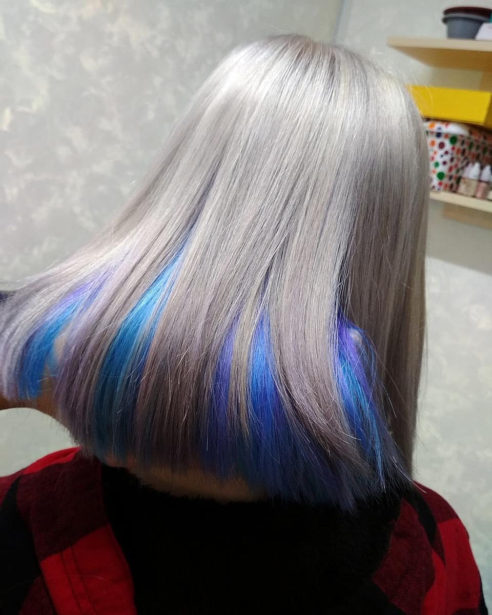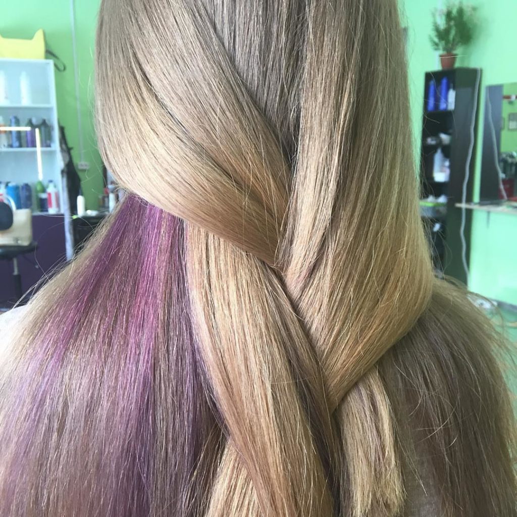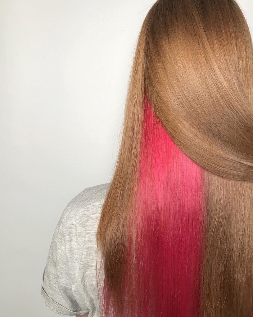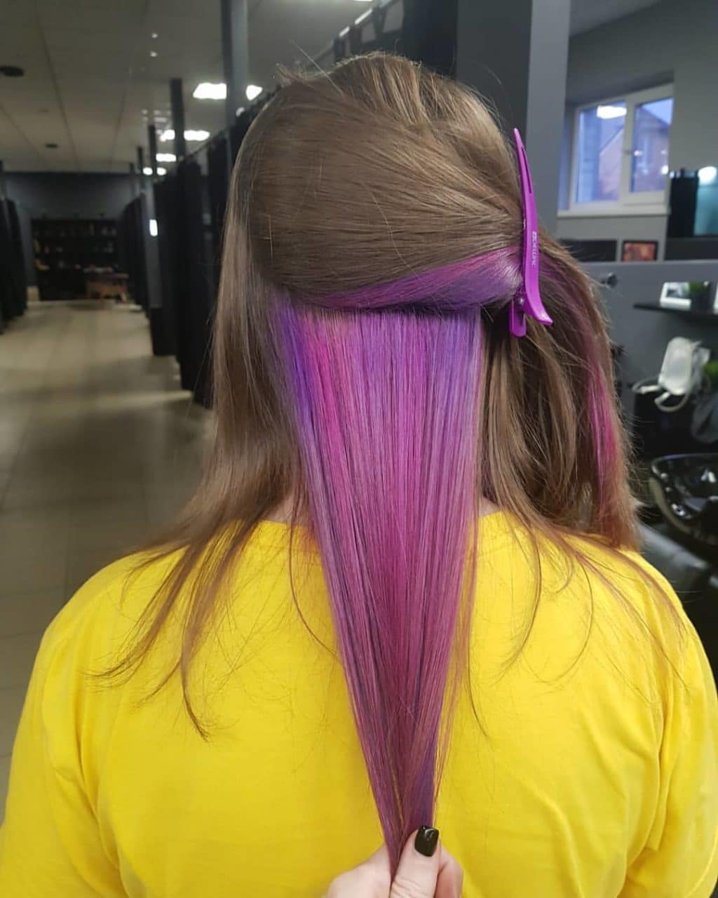 Hidden hair coloring dyes the lower occipital part of the hair, in different bright colors. It can be, like one bright color, or a set of multi-colored strands. After all, the main advantage in this type of coloring is that any crazy colors will not be visible immediately, but only when you yourself want it.