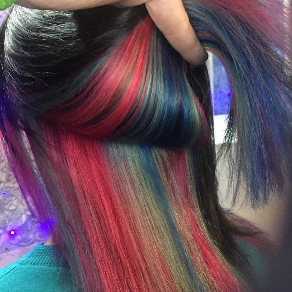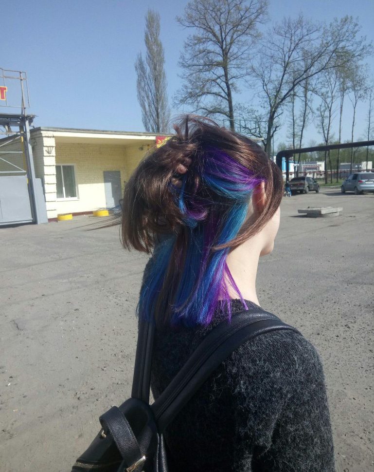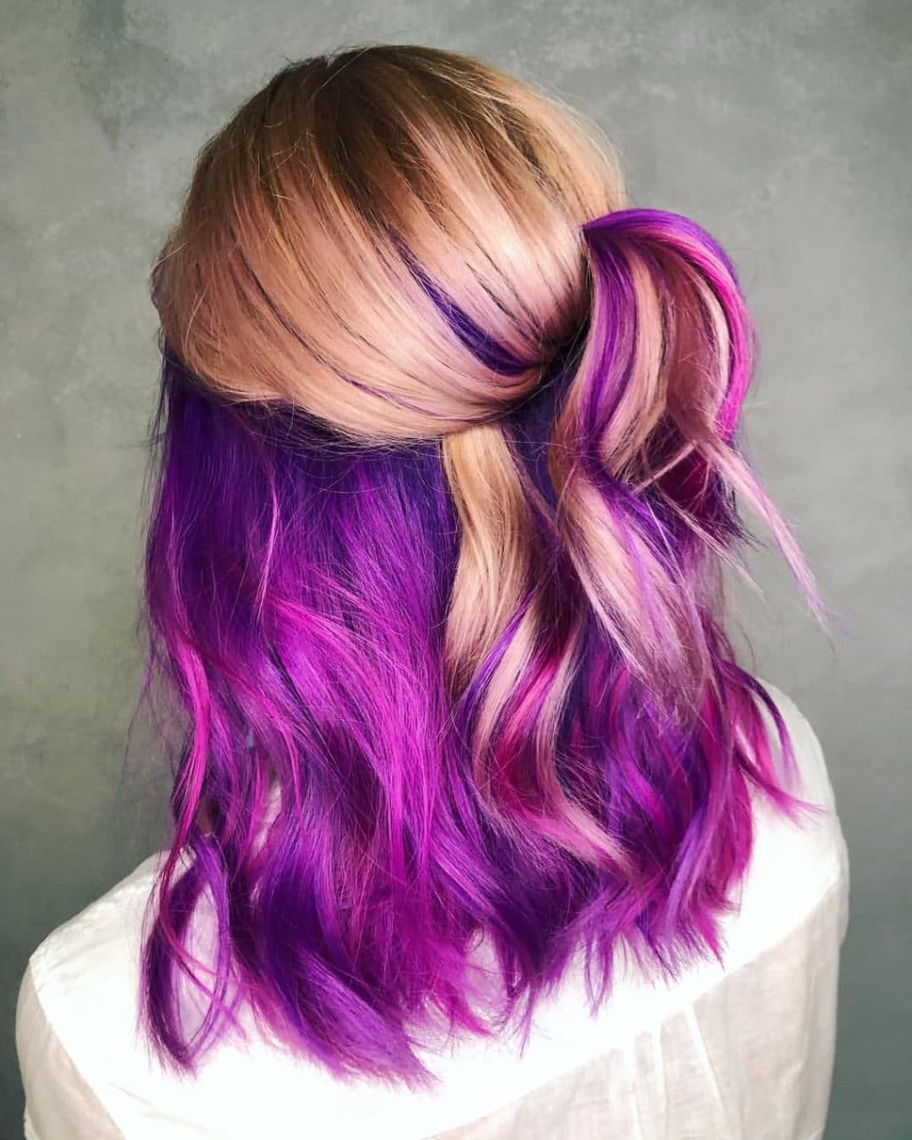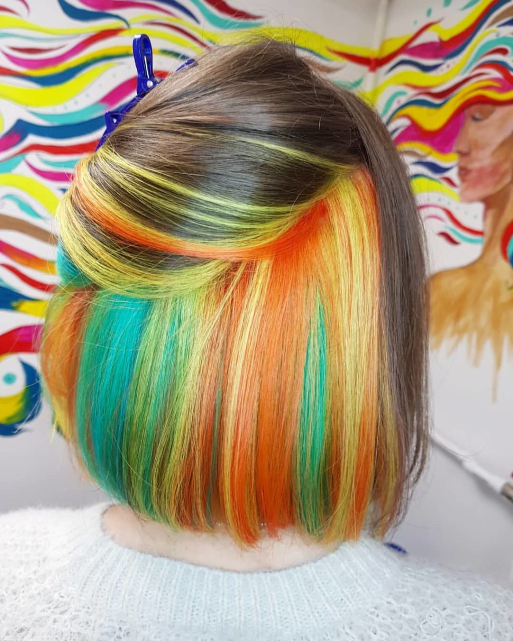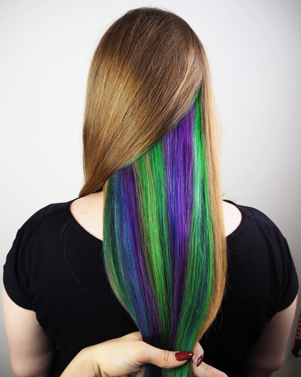 Hidden hair coloring dyes the lower occipital part of the hair, in different bright colors. It can be, like one bright color, or a set of multi-colored strands. After all, the main advantage in this type of coloring is that any crazy colors will not be visible immediately, but only when you yourself want it.