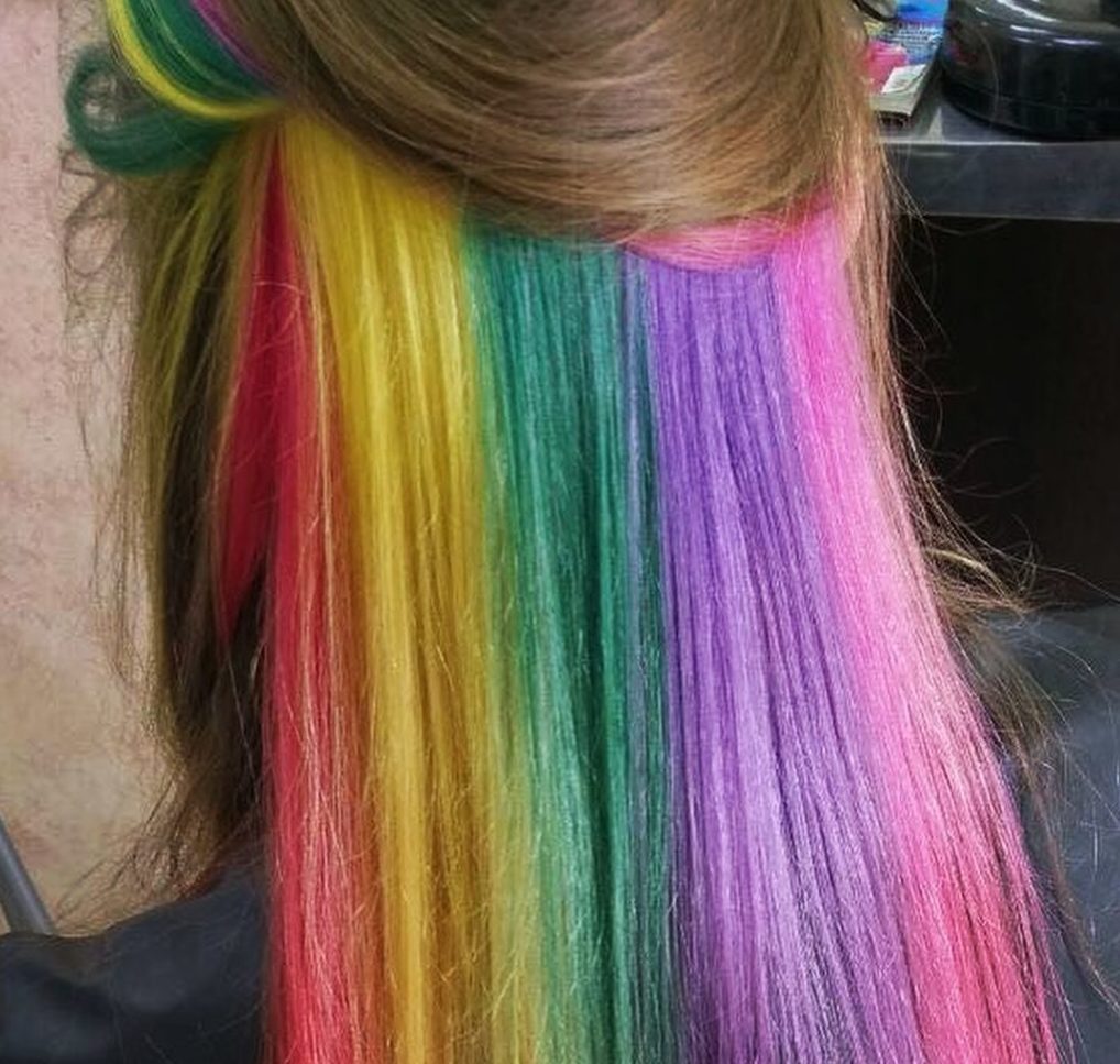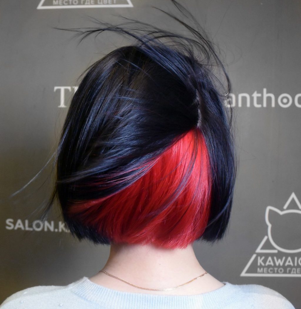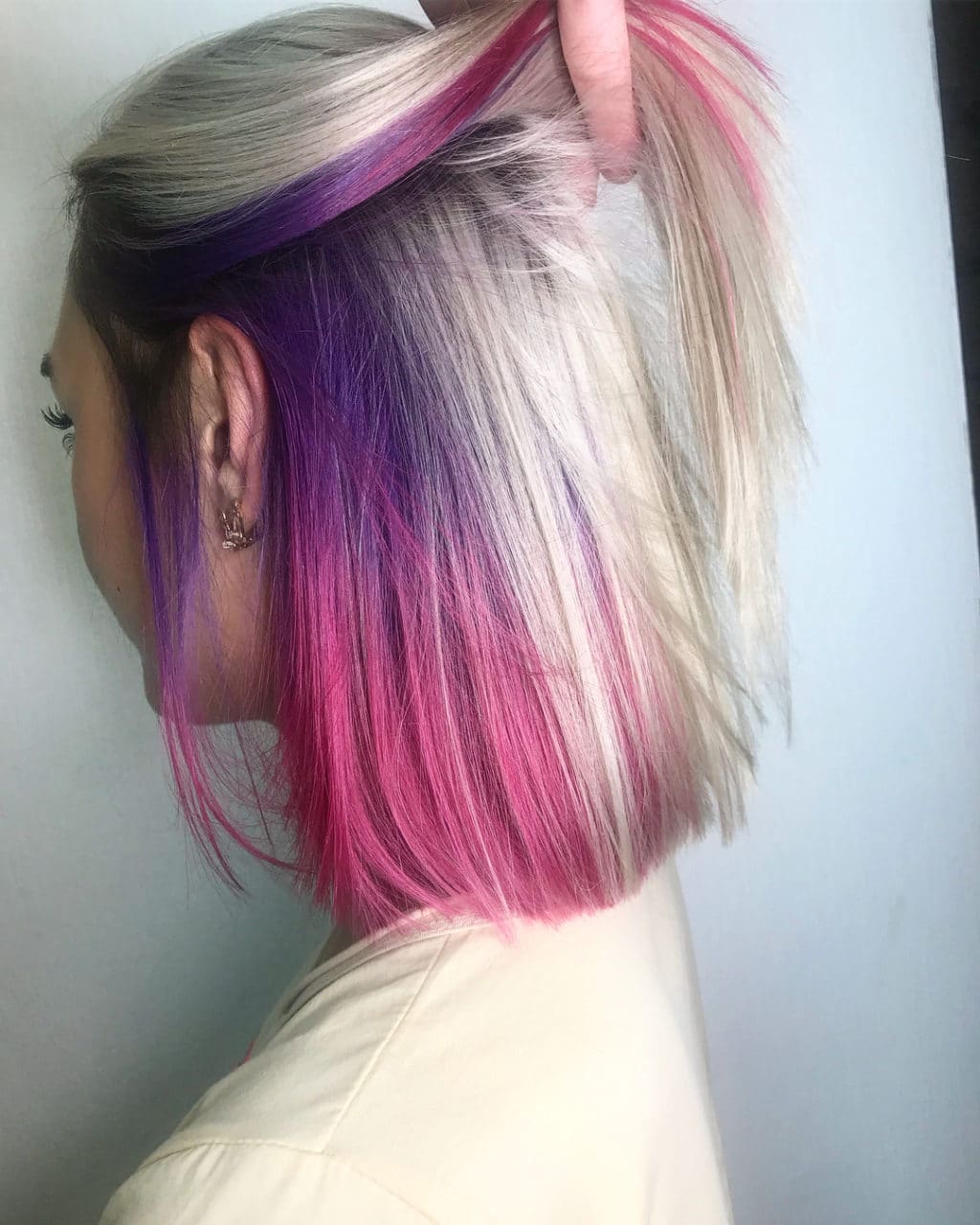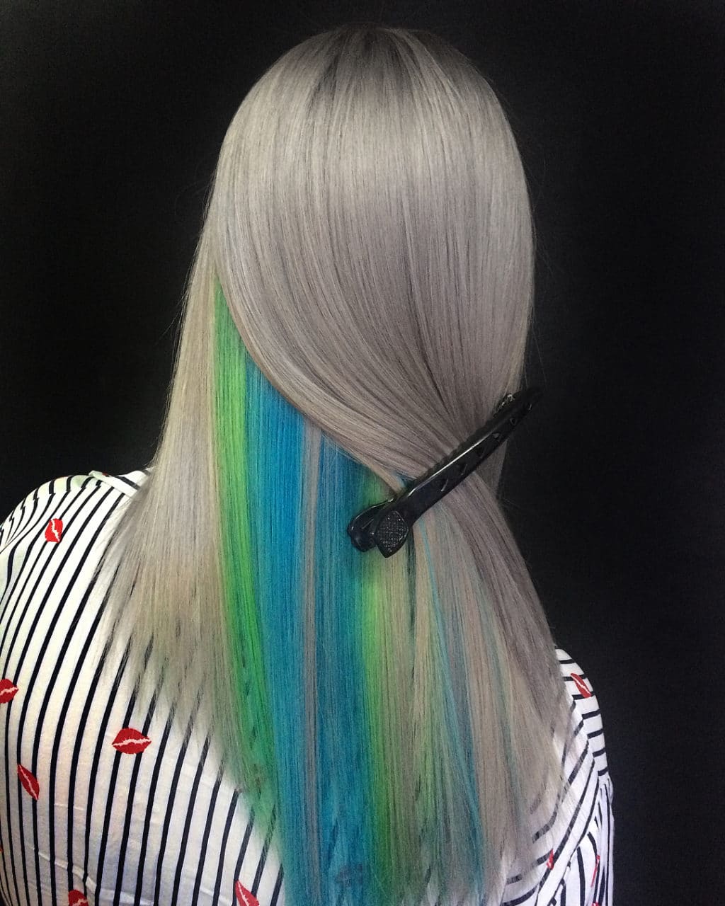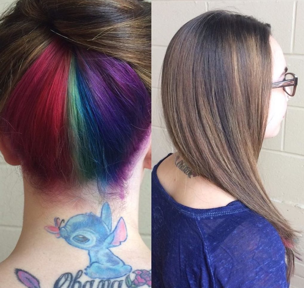 Hidden hair coloring dyes the lower occipital part of the hair, in different bright colors. It can be, like one bright color, or a set of multi-colored strands. After all, the main advantage in this type of coloring is that any crazy colors will not be visible immediately, but only when you yourself want it.