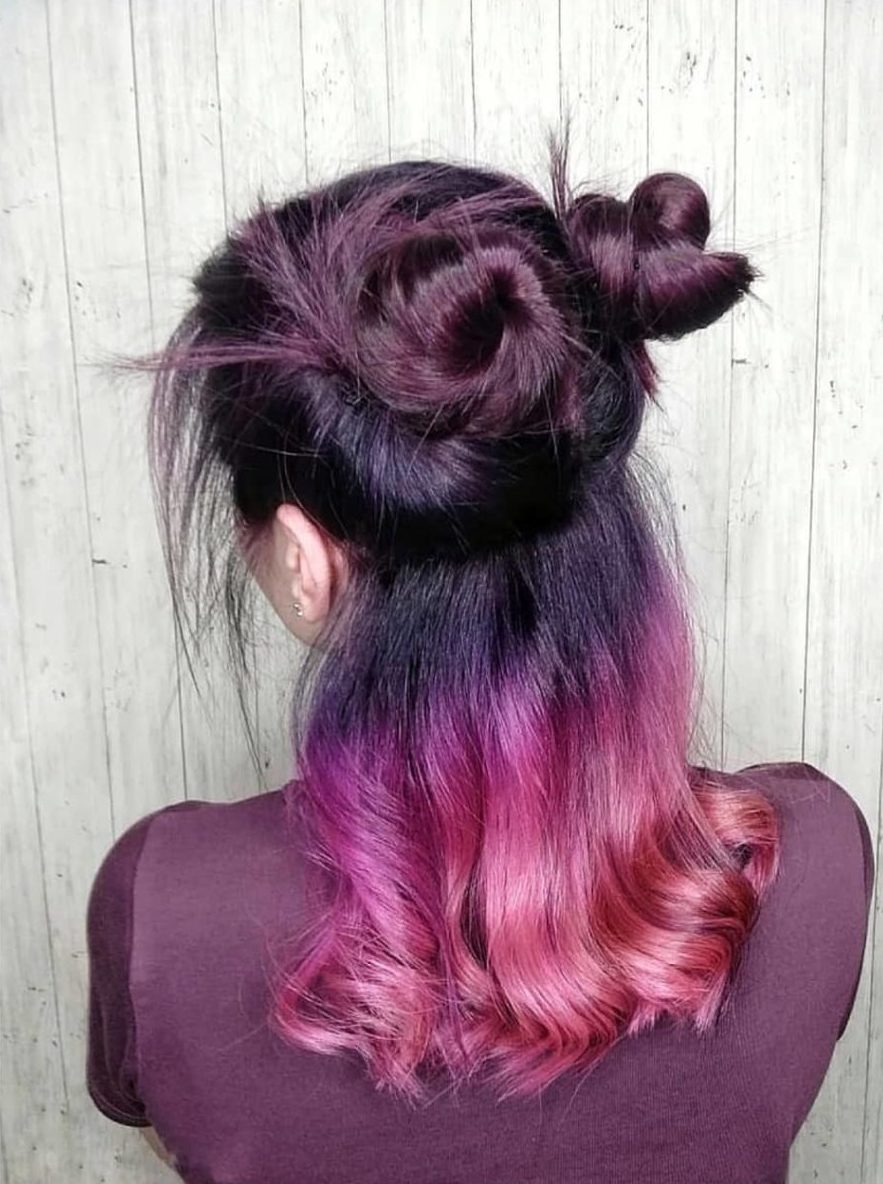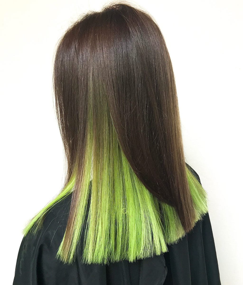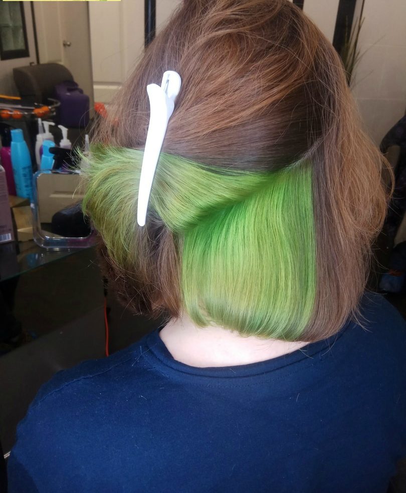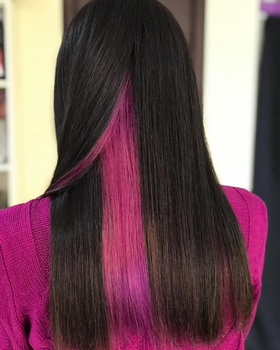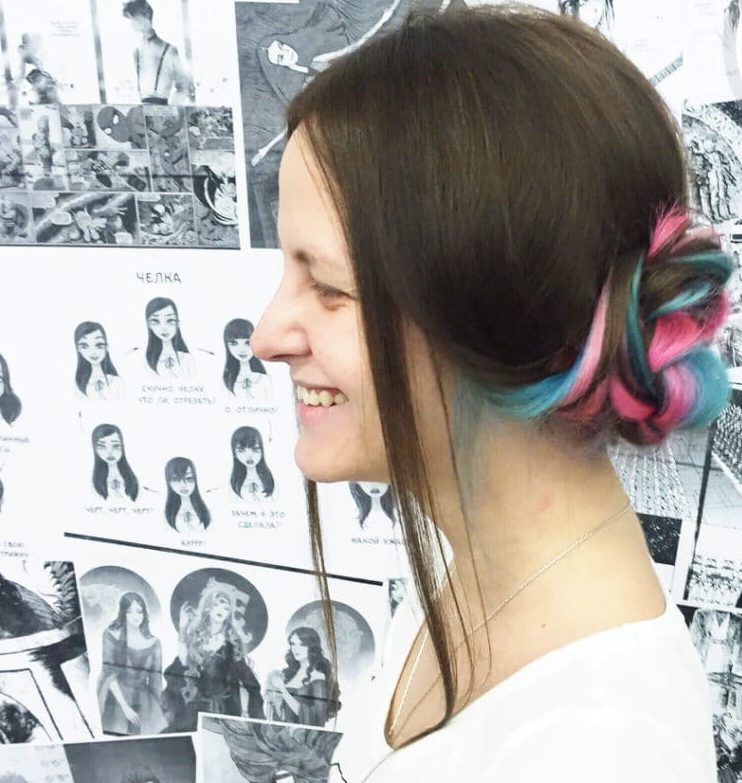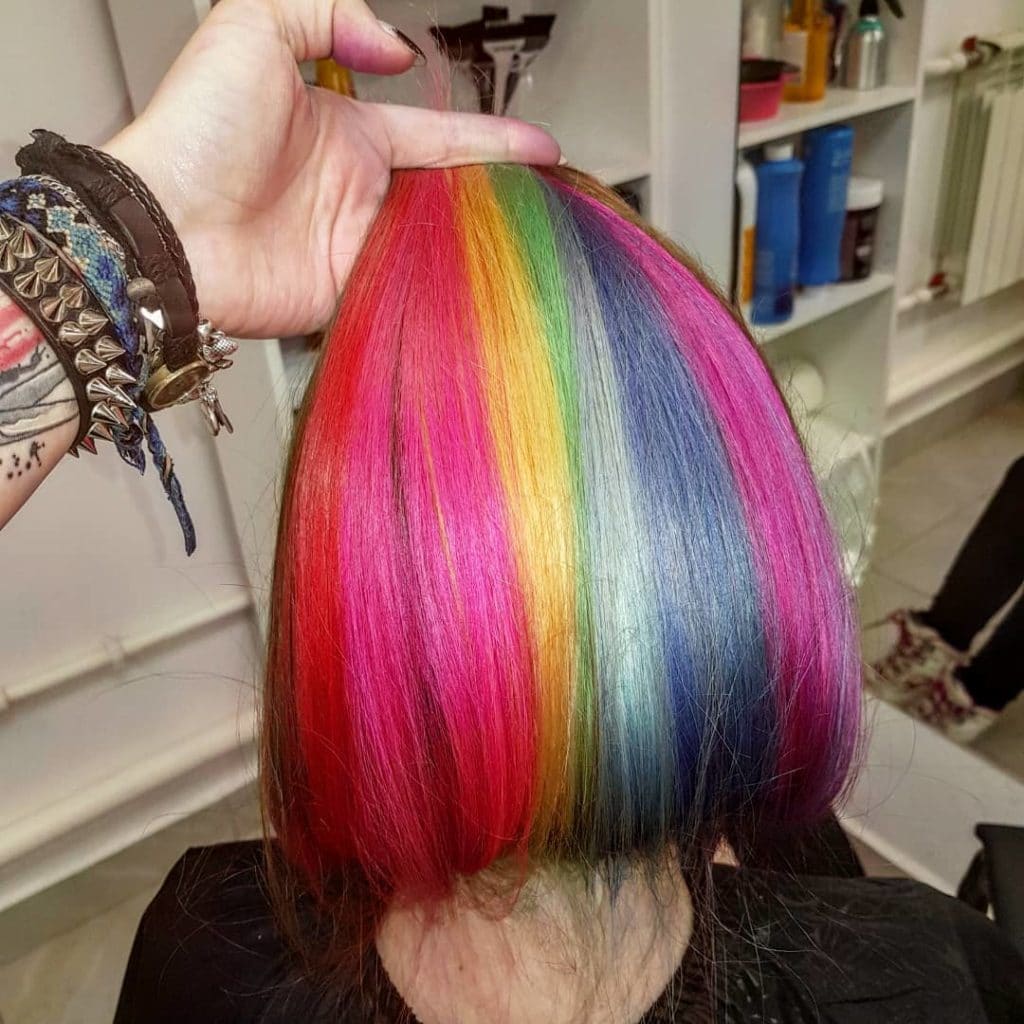 Hidden hair coloring dyes the lower occipital part of the hair, in different bright colors. It can be, like one bright color, or a set of multi-colored strands. After all, the main advantage in this type of coloring is that any crazy colors will not be visible immediately, but only when you yourself want it.