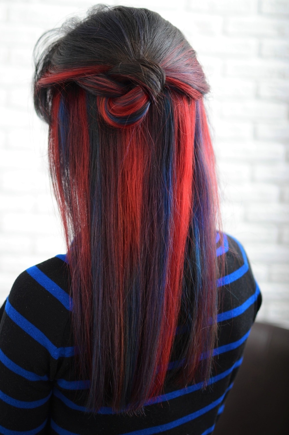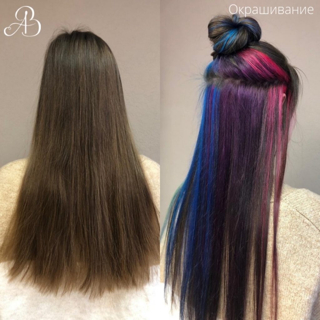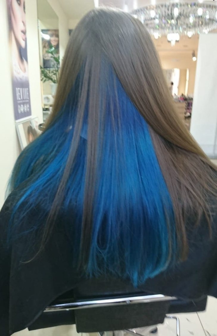 Blue, red, yellow and green are the most popular shades for hidden dyeing on long hair.. At your request or on the recommendation of the master, the strands can be dyed in such tones in both horizontal and vertical ways.