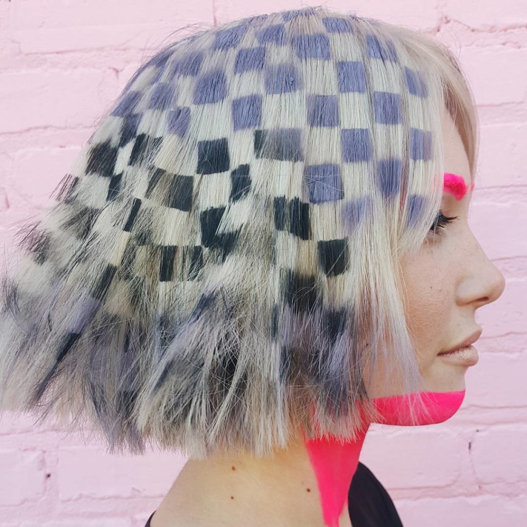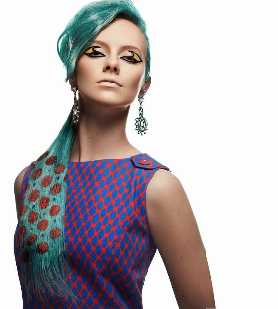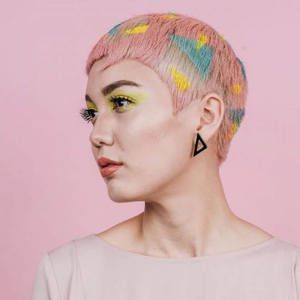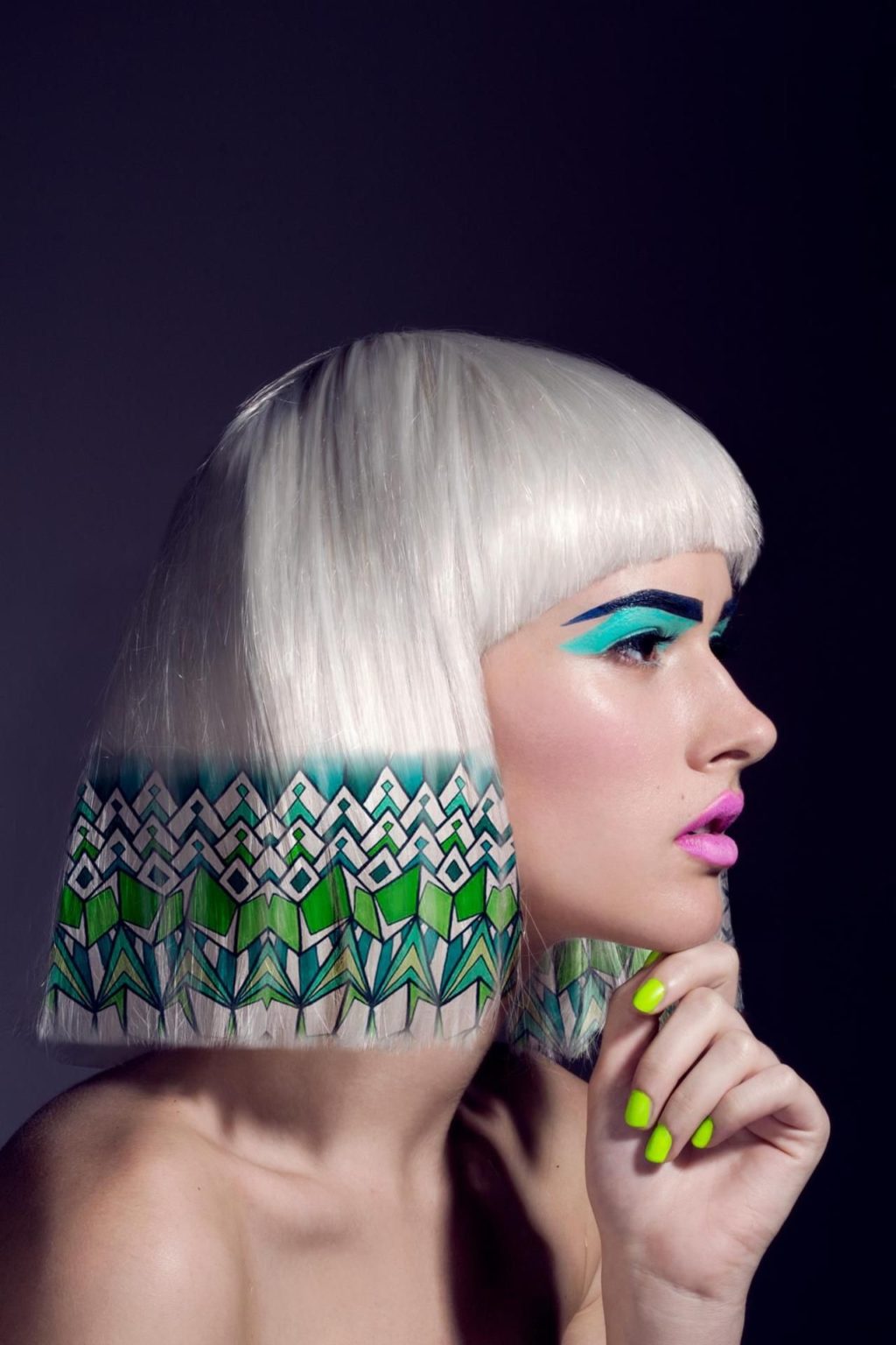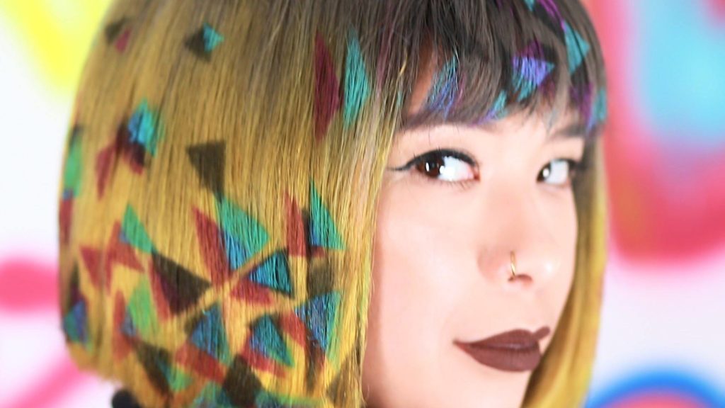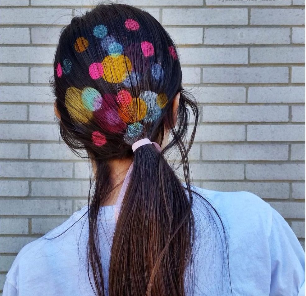 In this embodiment, various geometric shapes are drawn on the hair: squares, circles, triangles, polyhedra, or all together. Drawings can be small, like multi-colored small peas, or have more massive rectangles.