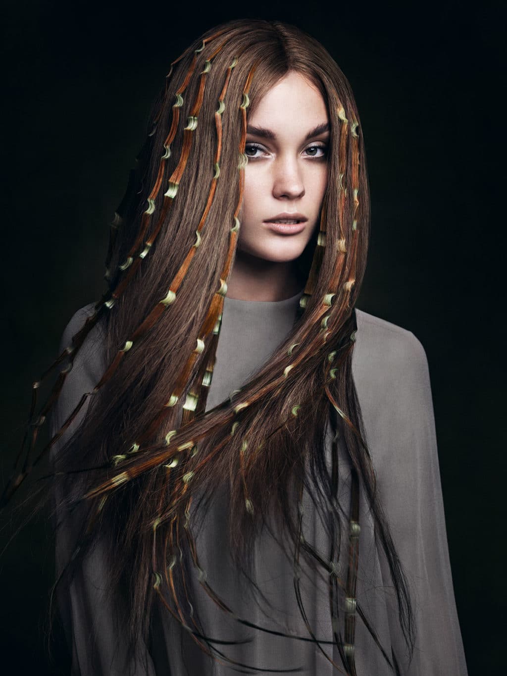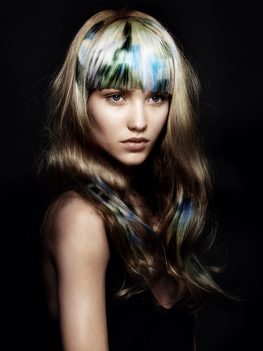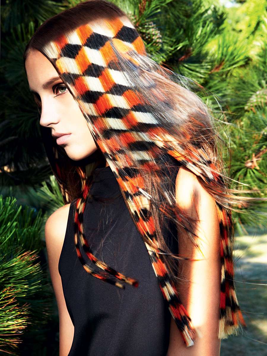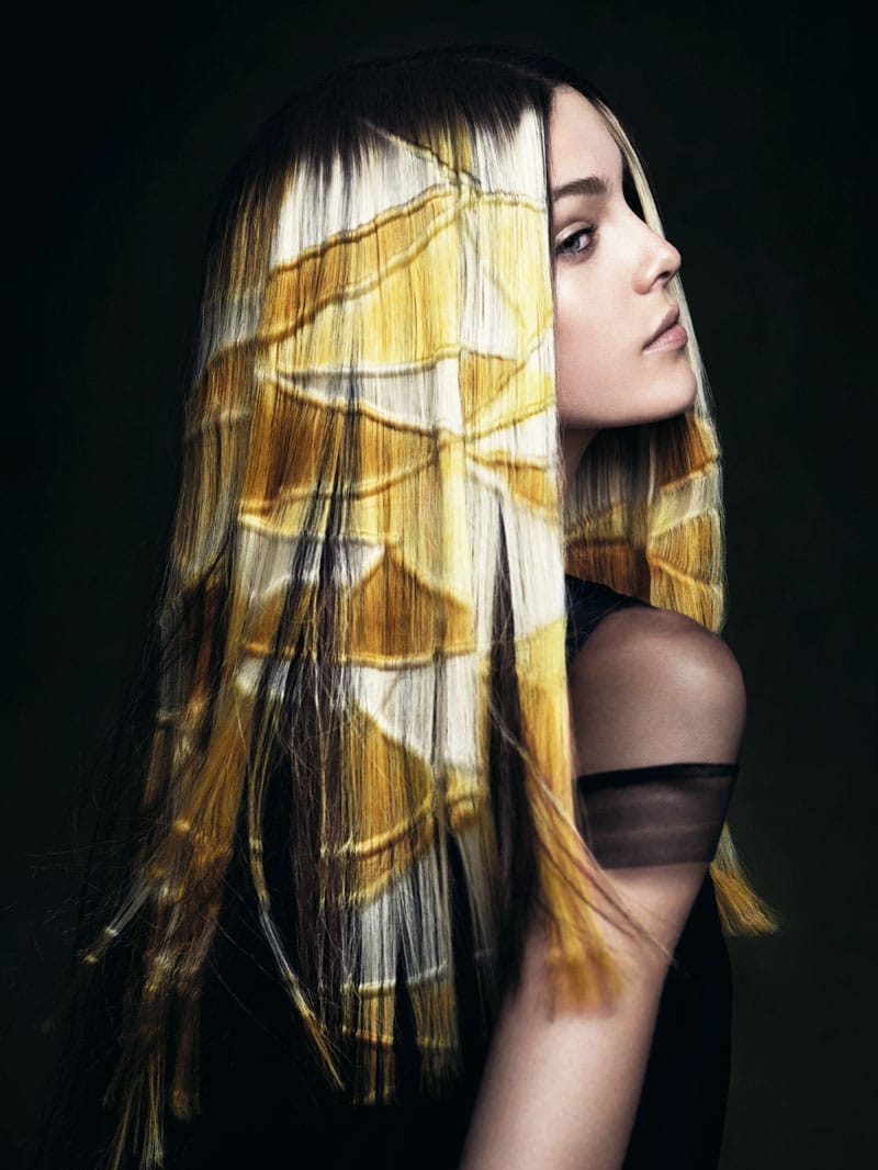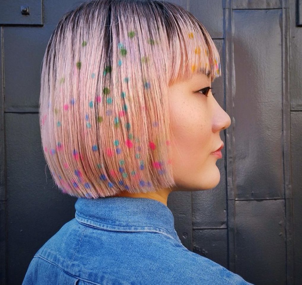 In this embodiment, various geometric shapes are drawn on the hair: squares, circles, triangles, polyhedra, or all together. Drawings can be small, like multi-colored small peas, or have more massive rectangles.