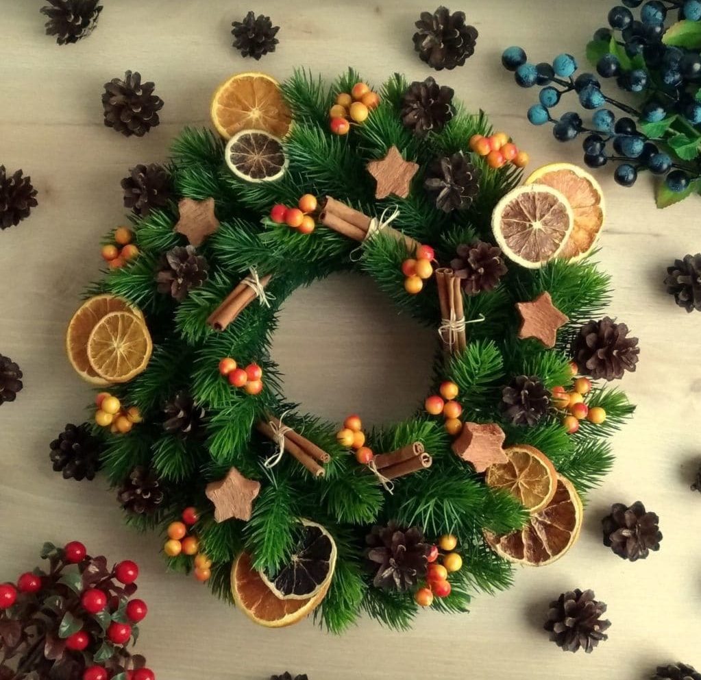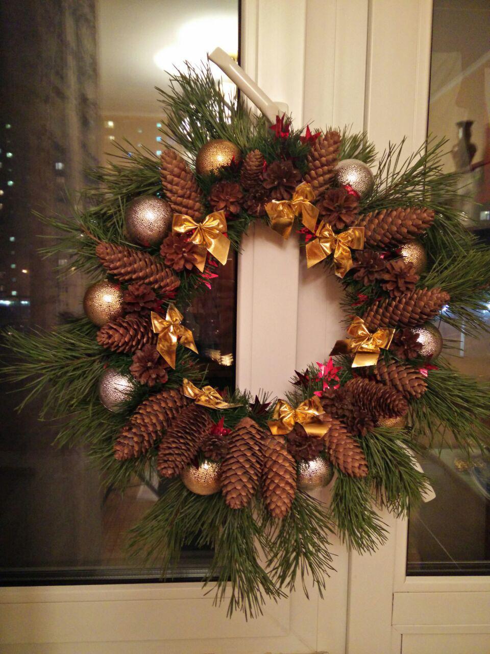 The decoration that came to us from the West is Christmas wreaths of cones or other attributes that need to be hung on the front door. Typically, such wreaths are hung from the outside of the door, but you can hang a wreath from the inside.