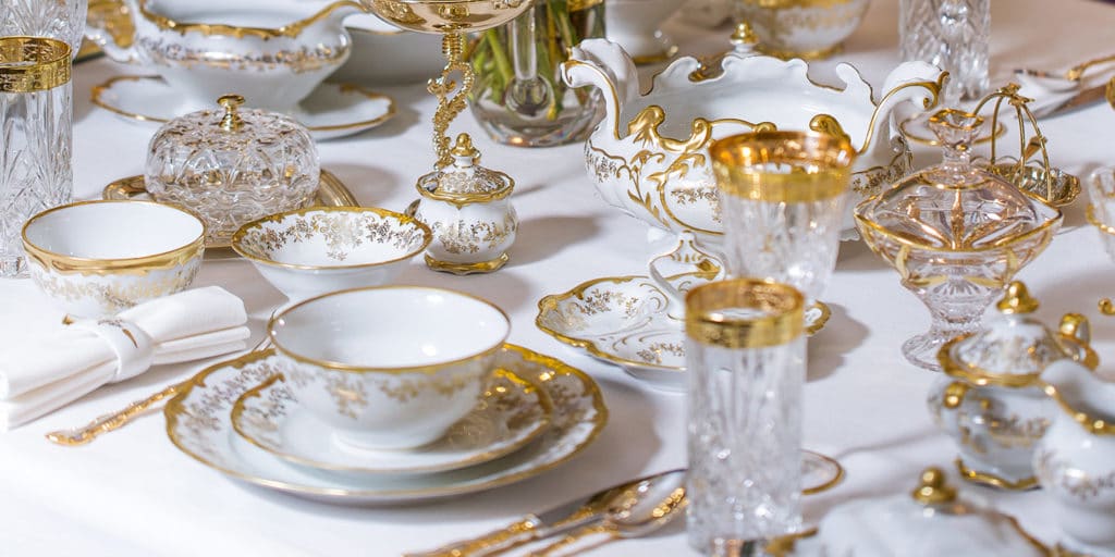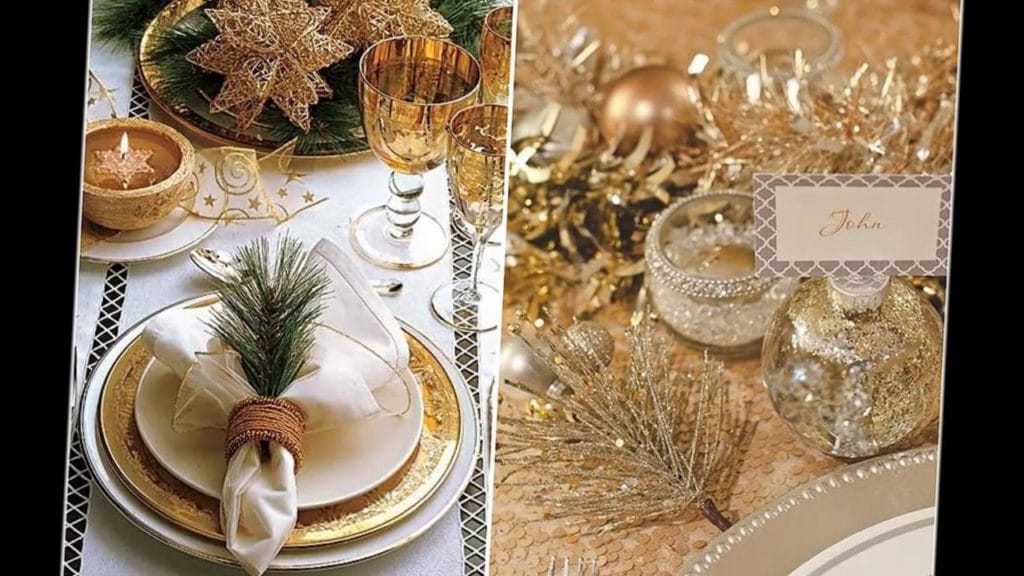 The dishes on the New Year's table should have a gold pattern or ornament, here the main thing is the color itself, and not the pattern. To dilute the snow-white picture, you can add napkins with a light menthol shade to the table setting.