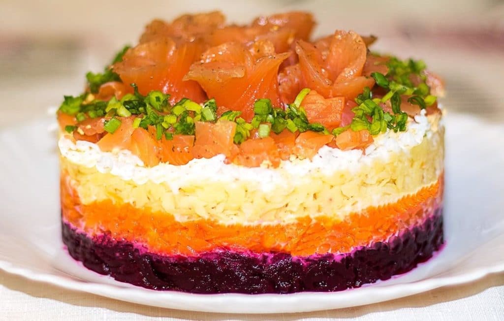 - We clear the salmon from seeds and peel, then finely cut into pieces. Hard cheese should be grated on a hard grater. Then proceed to mixing the ingredients. In a deep bowl, first lay out a layer of fish, after onions, eggs, carrots, grated cheese, beets. Do not forget to coat each layer with mayonnaise.