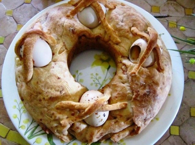 - Then put the parchment on a baking sheet, in the center of which you need to put a glass. Put the minced meat around the glass, trying to give the future cake a beautiful shape. Then push the halves of the boiled eggs into the minced meat, at an equal distance from each other. Puff pastry should be cut into strips and make them a pie. With yolk, you can grease the dough itself and then send the cake to the oven for 40 minutes at a temperature of 190 degrees.