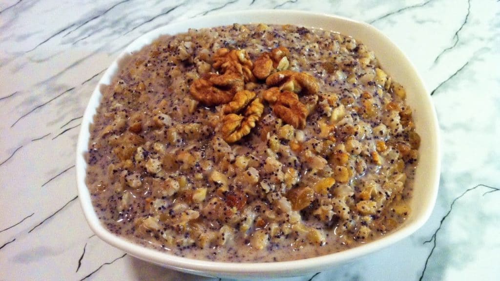 - Poppy need to grind in a coffee grinder. After pouring it with boiling water and leave to infuse for 5 minutes. When time runs out, strain the poppy seeds and add to the cooked grain. Cut nuts, candied fruit into small pieces and mix with raisins. Add them to poppy seeds and wheat.