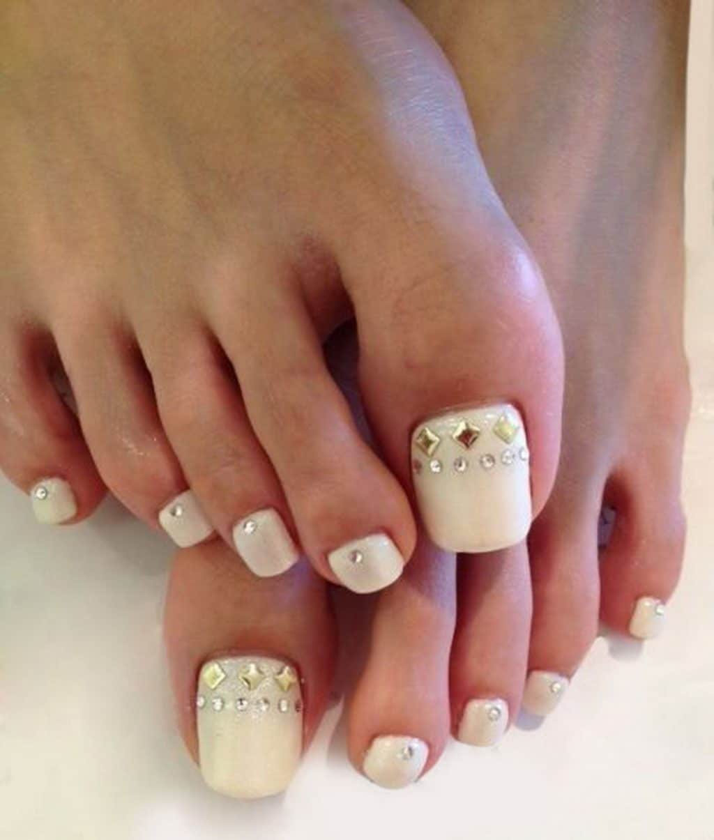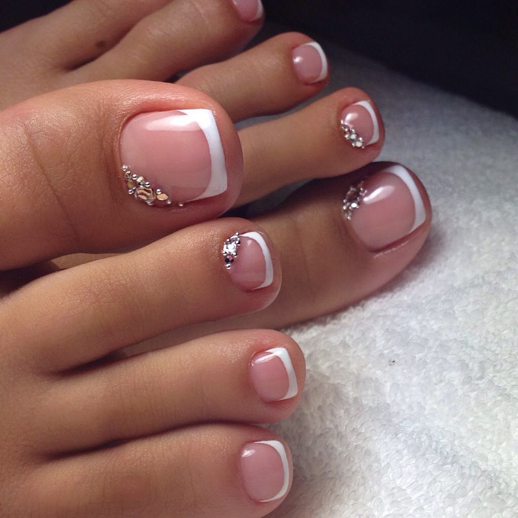 French - It is a universal classic that is perfect for any style, as well as the color of the dress. But remember that it is classical French that is considered universal. This look is always made in white, standard color, with the addition of a small amount of rhinestones or sparkles. If there are drawings on it, then you already need to think about whether this pedicure will suit your dress.