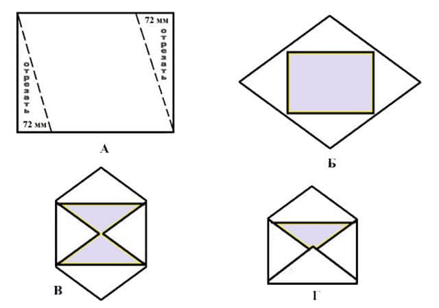 - Now take the second sheet of colored paper and cut the envelope of the same shape as the previous one, but without the sides and bottom.