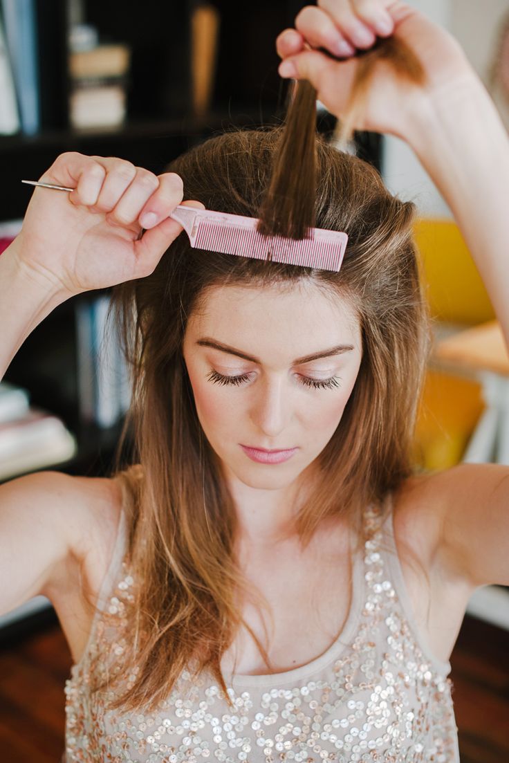 Thanks to the combing of hair at the roots, you can give them visual volume, which will add lightness to them. Such hair can be laid in a shell or made a bun to hide greasy locks.