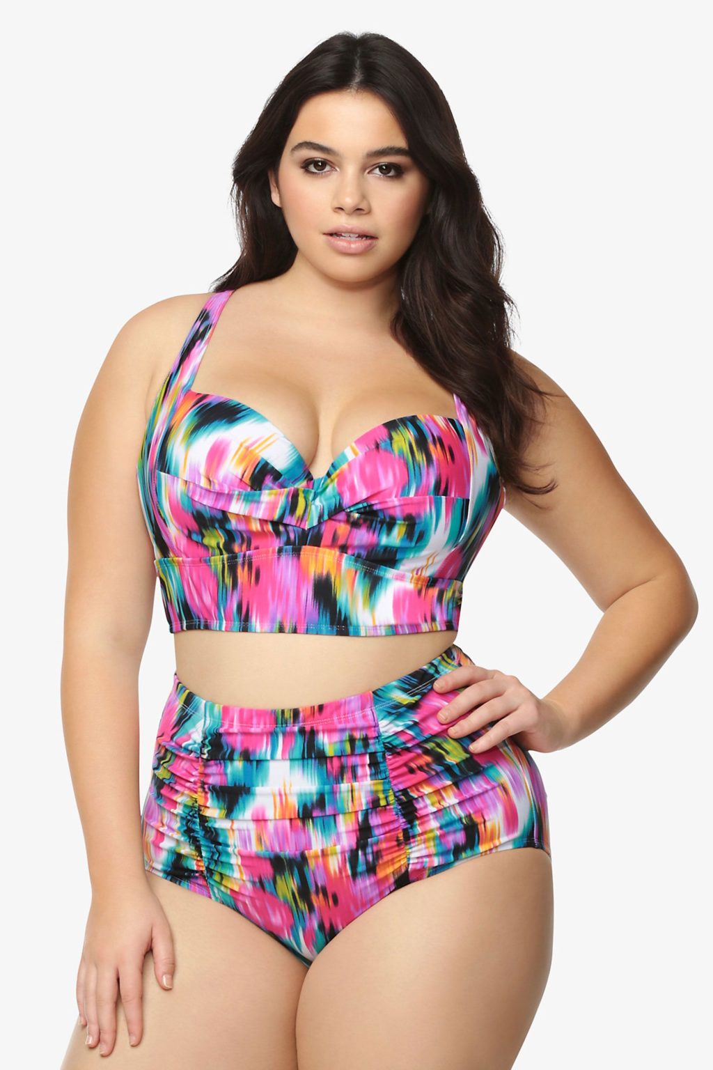 High-waisted shorts will perfectly hide a problem stomach and emphasize the chest. As one-piece swimsuits, it is better to choose models with slimming lines. And as a print, an excellent solution would be to choose horizontal stripes or other geometry.