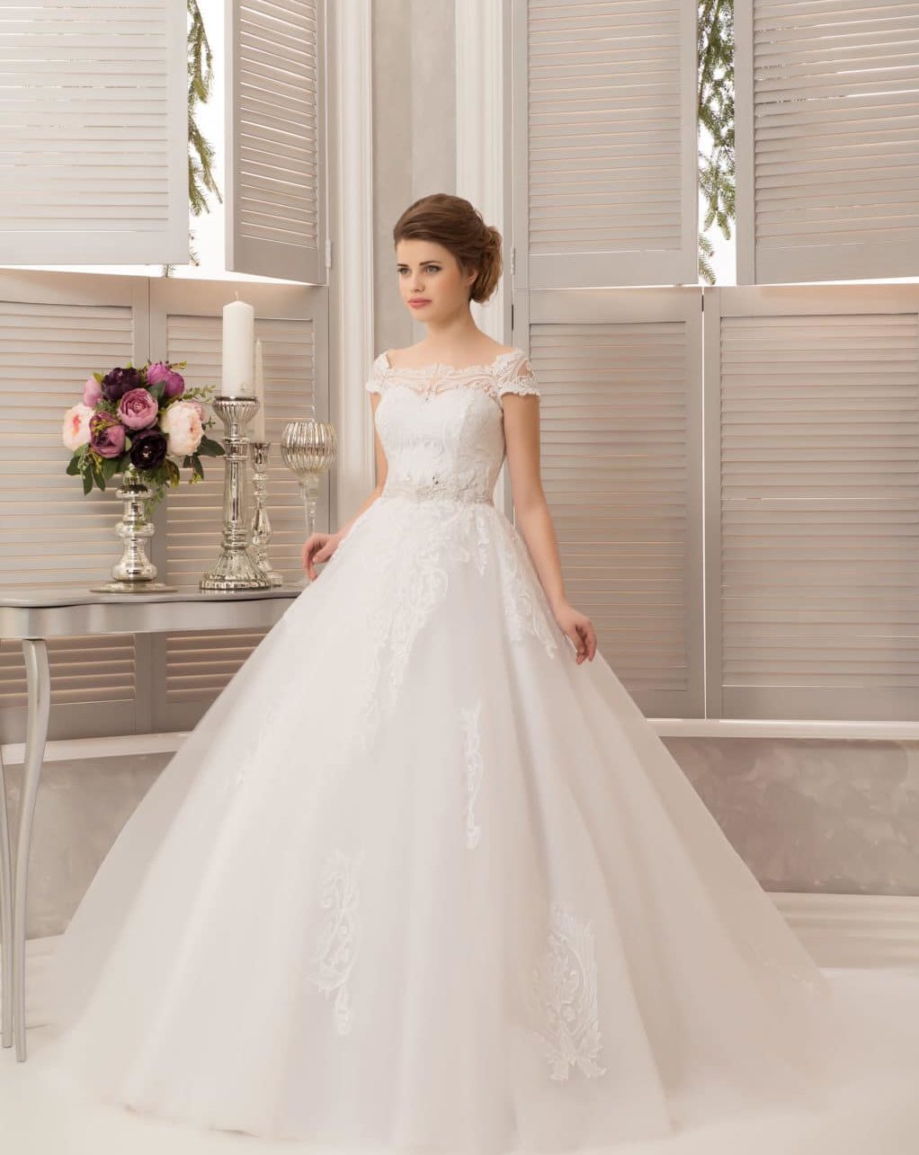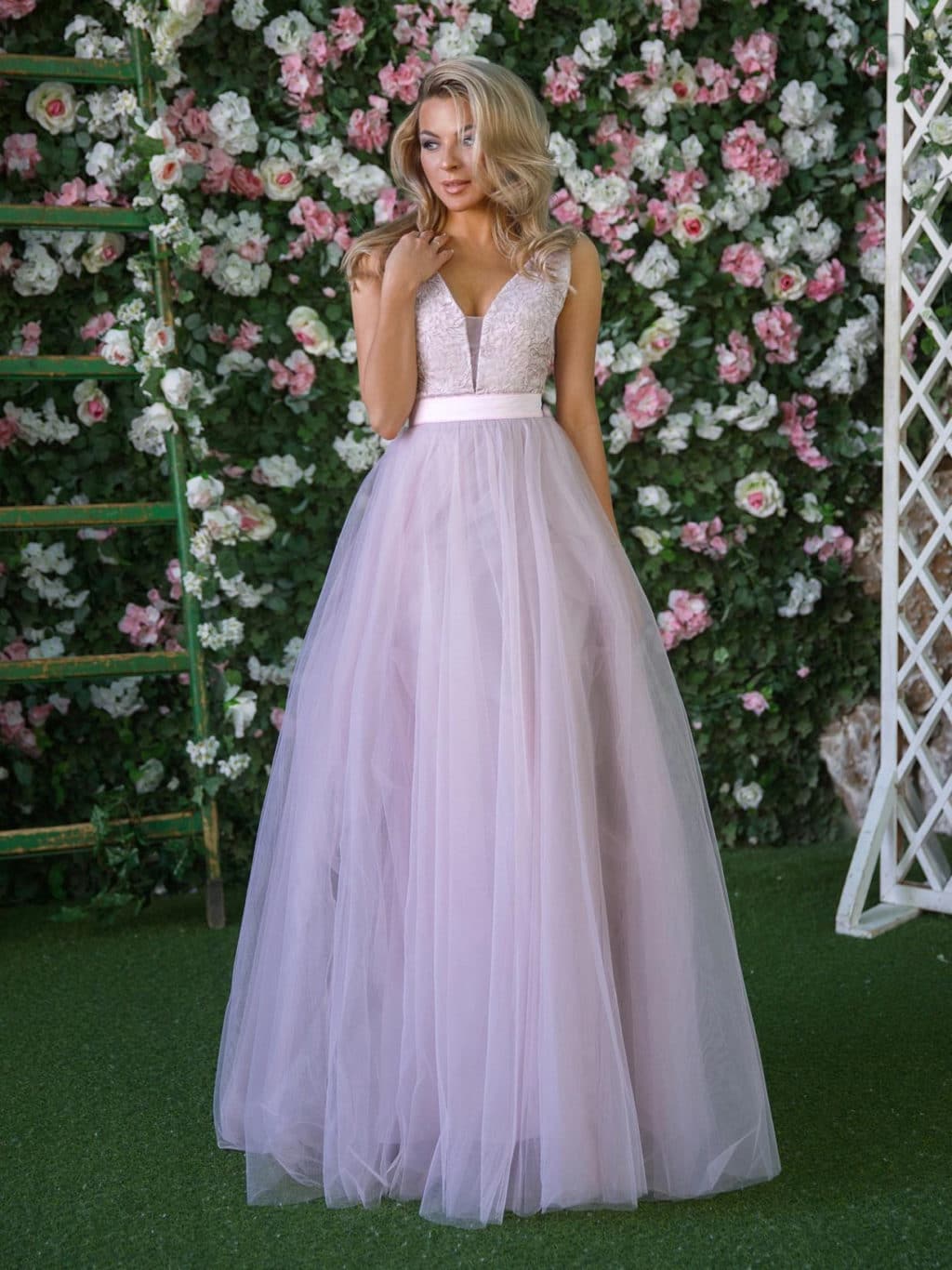 A light, ball gown in a pale gray smoky design will create an airy look. The dress is decorated with flower buds and delicate leaves in cream color, which allows you to choose shoes, manicure, as well as a handbag in bright colors.