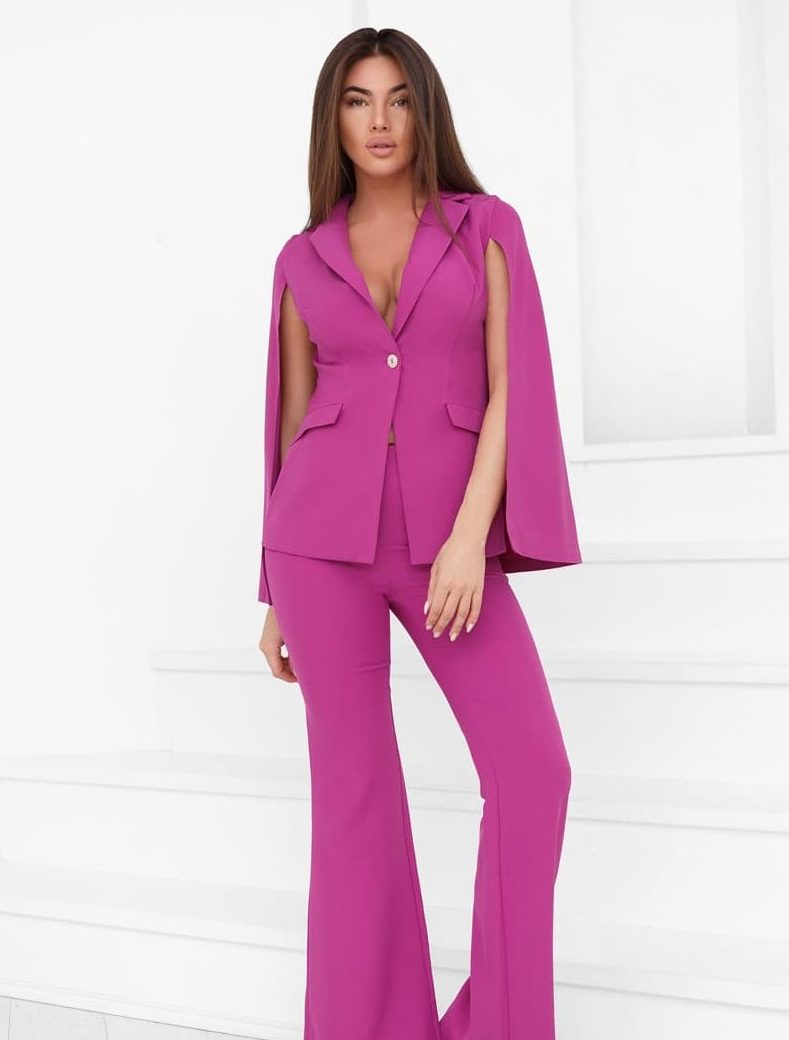 An unusual trouser suit in pink is suitable for any figure. Pick up black pumps, a black clutch under it, and a pink manicure and your look will be remembered for a long time.