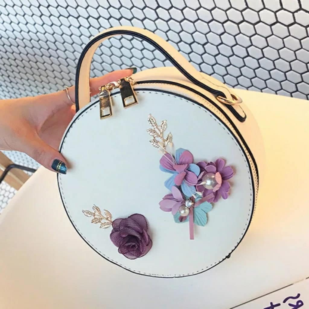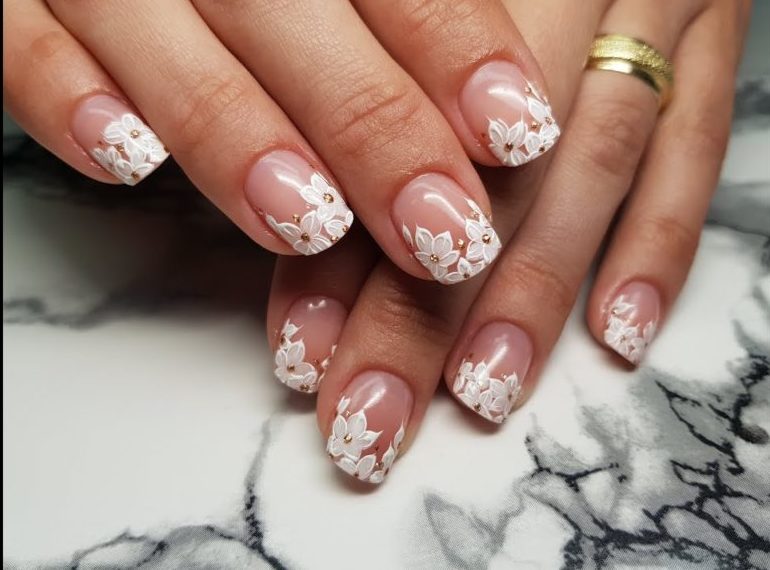 We pick up the bag in white with a delicate decor of flowers, and on the nails we make an unusual light jacket.